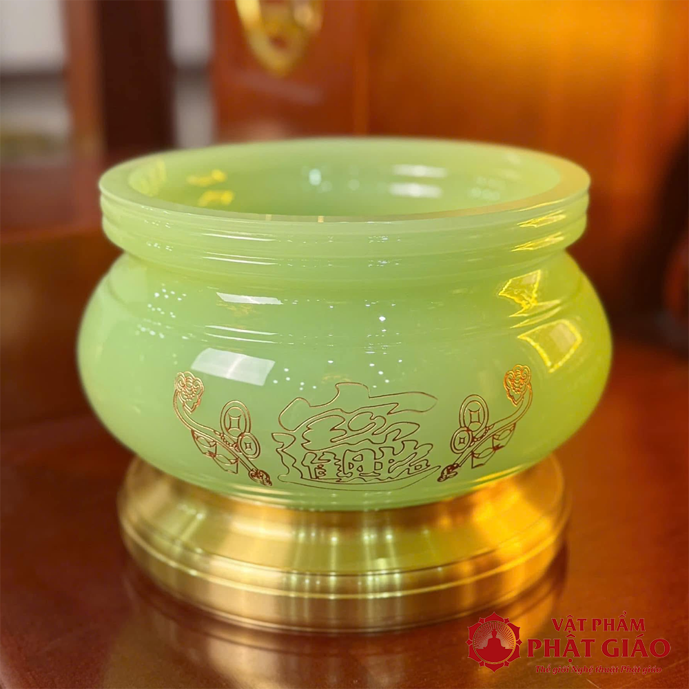 Bát Hương Chiêu Tài Tiến Bảo Bằng Đá Xanh Ngọc, Màu Xanh Ngọc là biểu tượng của sự thanh khiết và trang nghiêm, mang lại sự bình yên và thanh tịnh cho không gian thờ cúng của bạn. Với chất liệu đá lưu ly cao cấp, chiếc cốc không chỉ mang vẻ đẹp trong suốt như pha lê, mà còn được chạm khắc tinh xảo chữ Phật, tạo nên một vật phẩm vừa đẹp mắt, vừa linh thiêng.