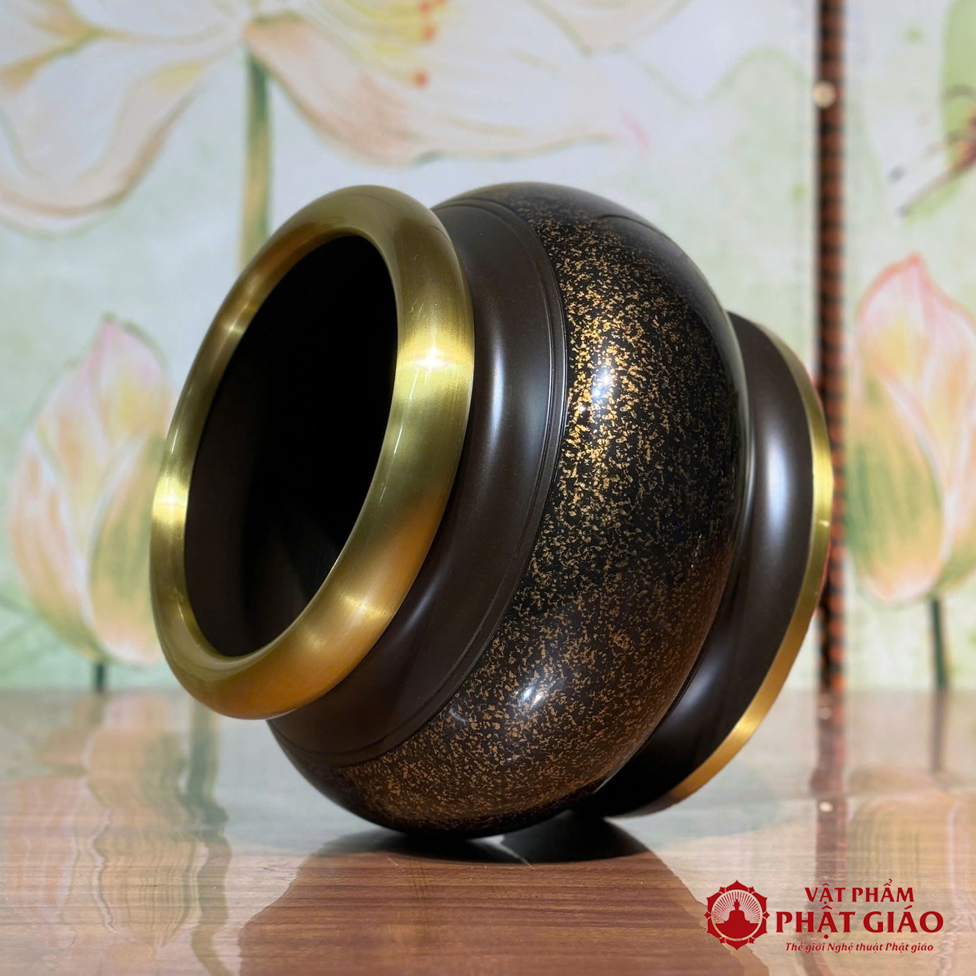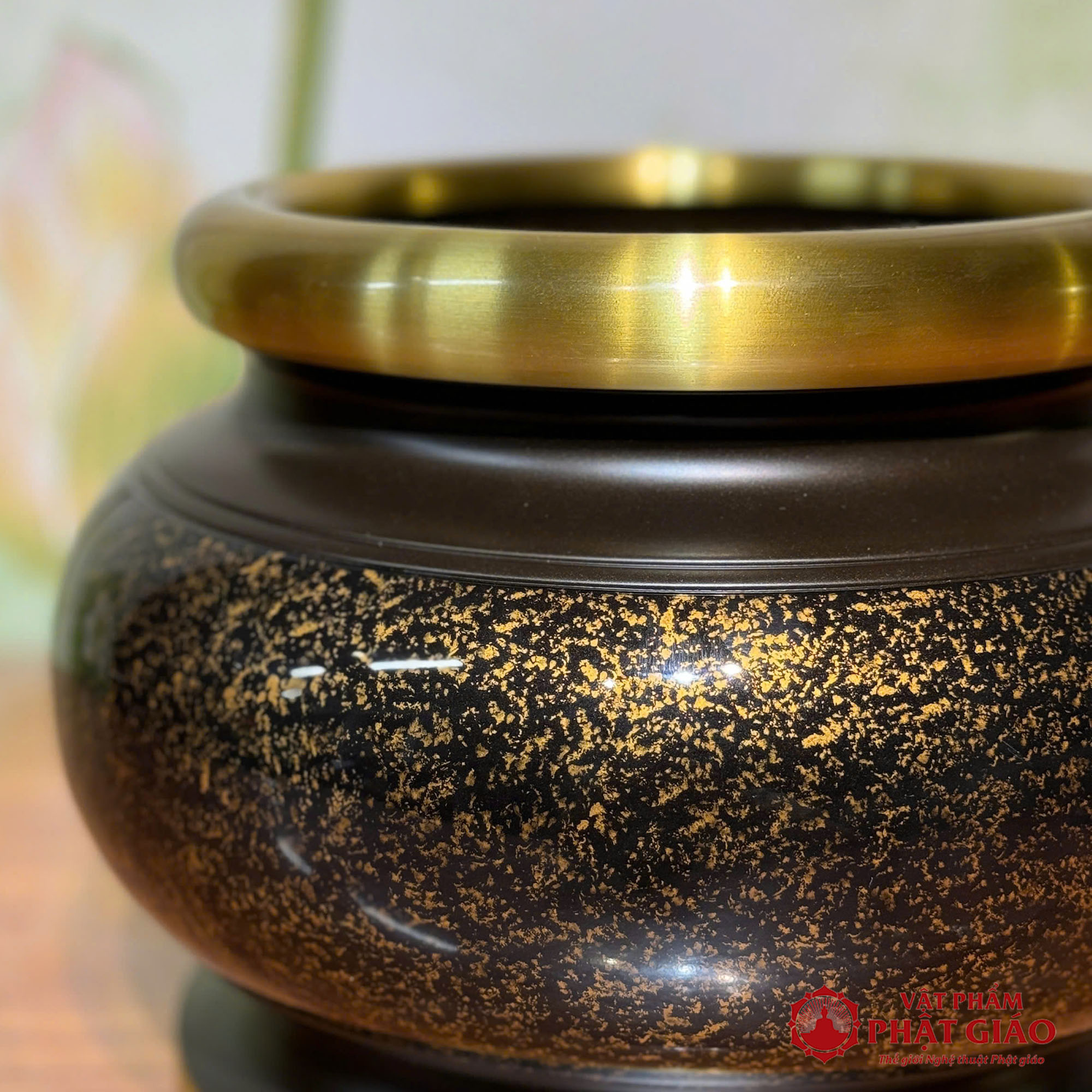 Bát hương được thiết kế theo phong cách cổ điển kết hợp hiện đại, với lớp đồng đen vân đá sần mang đến vẻ mạnh mẽ, sang trọng nhưng không kém phần tôn nghiêm.