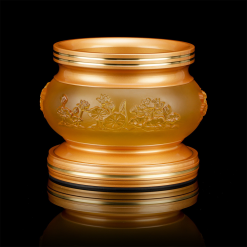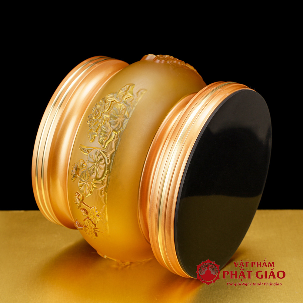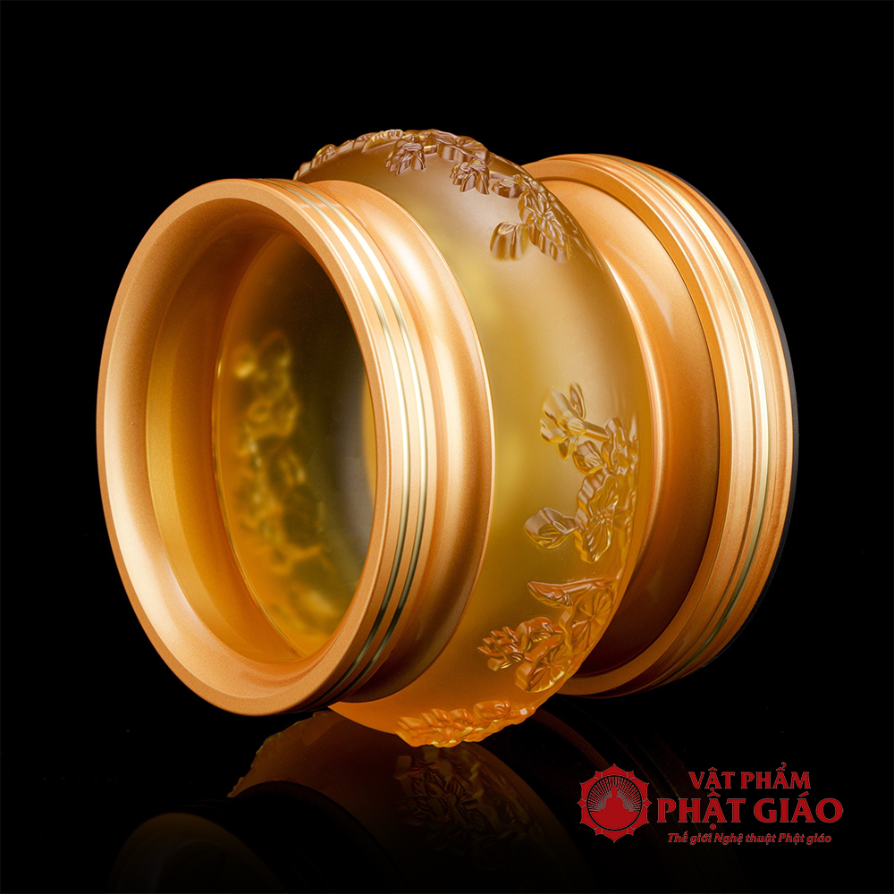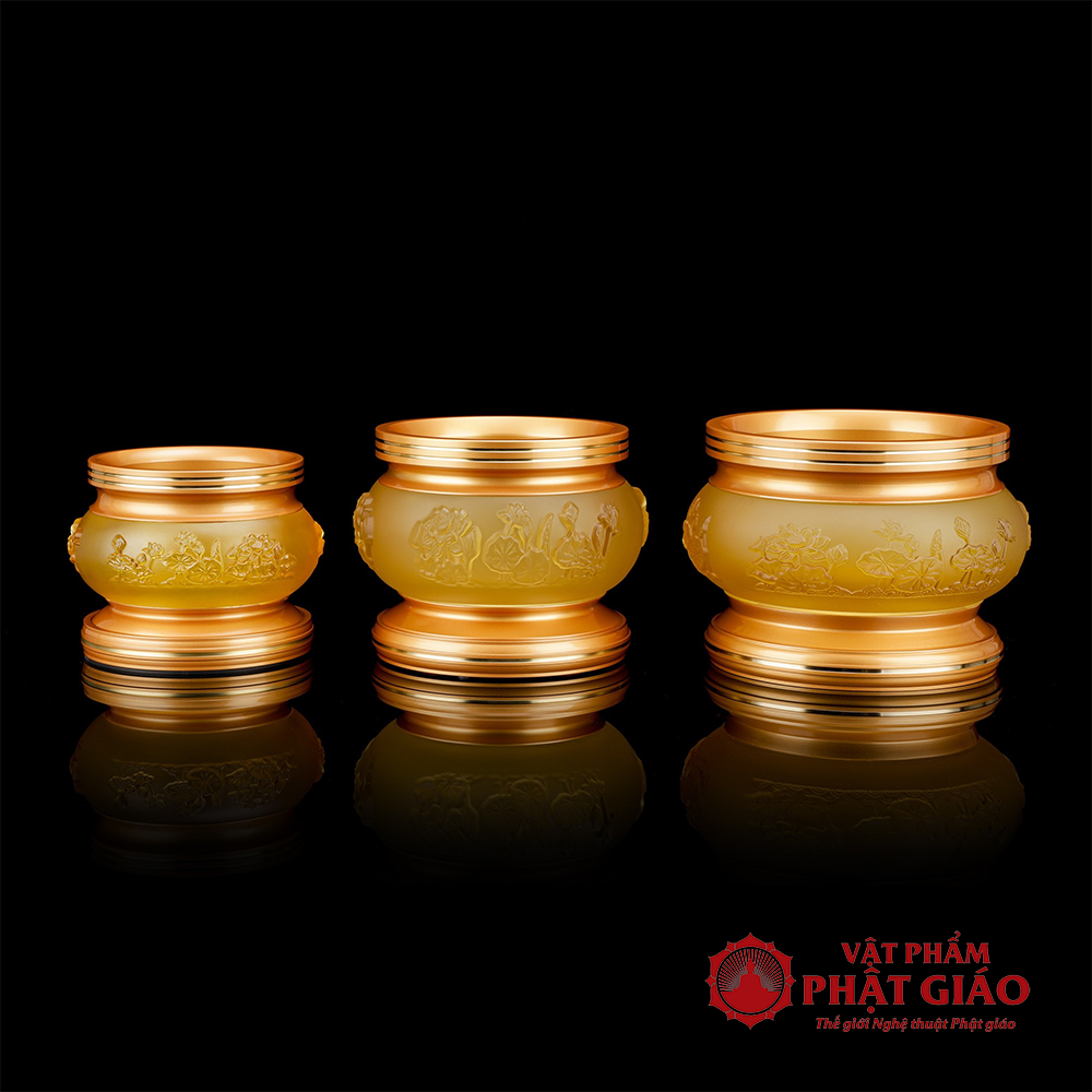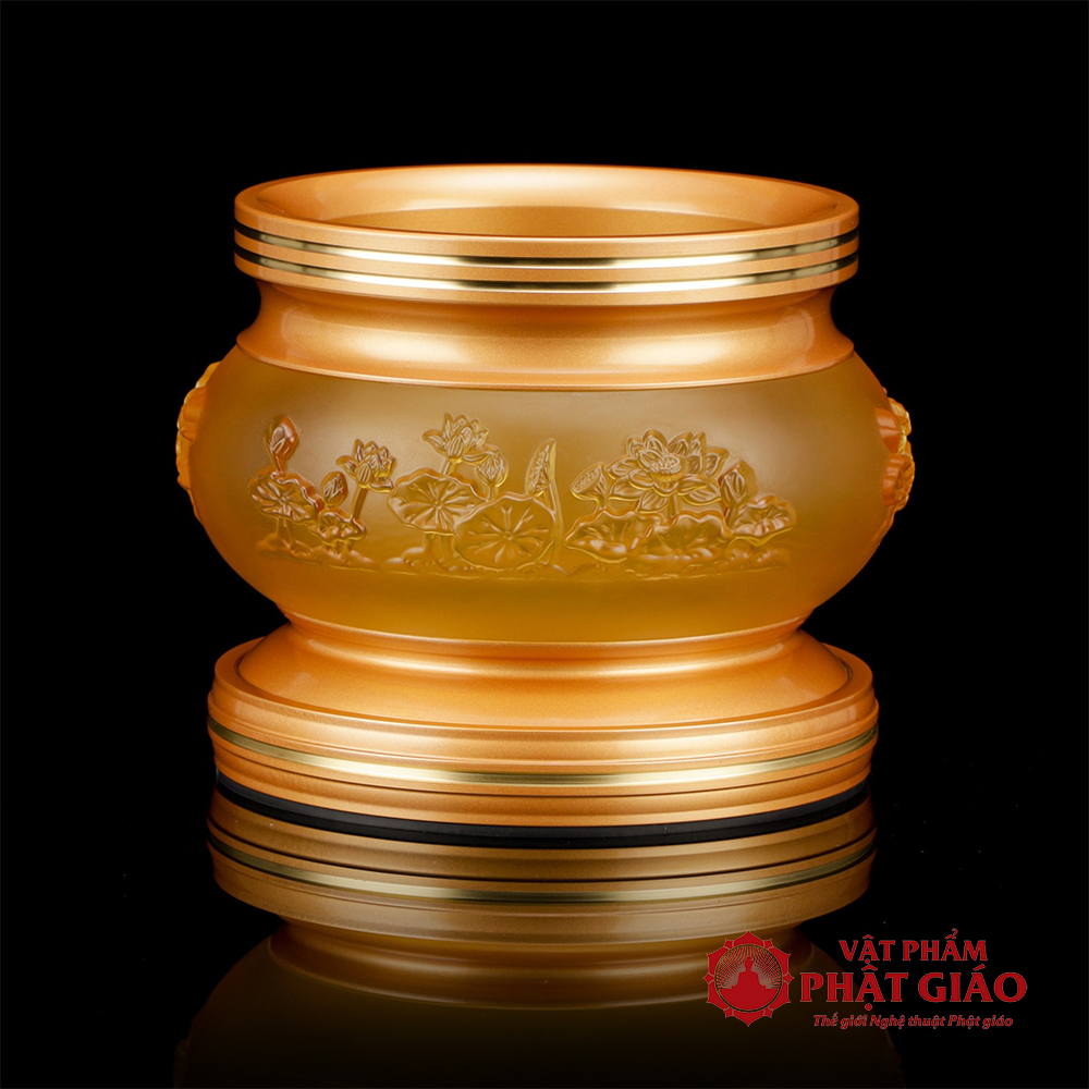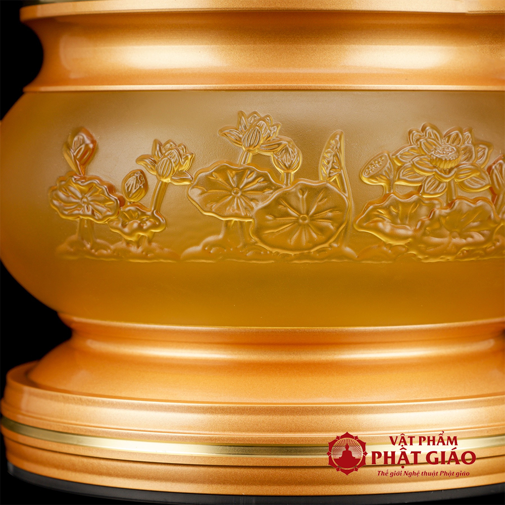 Mẫu bát hương này được chế tác từ lưu ly vàng cao cấp, kết hợp họa tiết hoa sen khắc nổi – biểu tượng của sự thanh tịnh, giác ngộ và thoát tục trong Phật giáo.