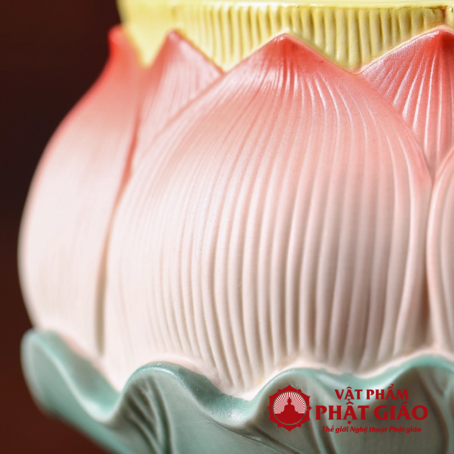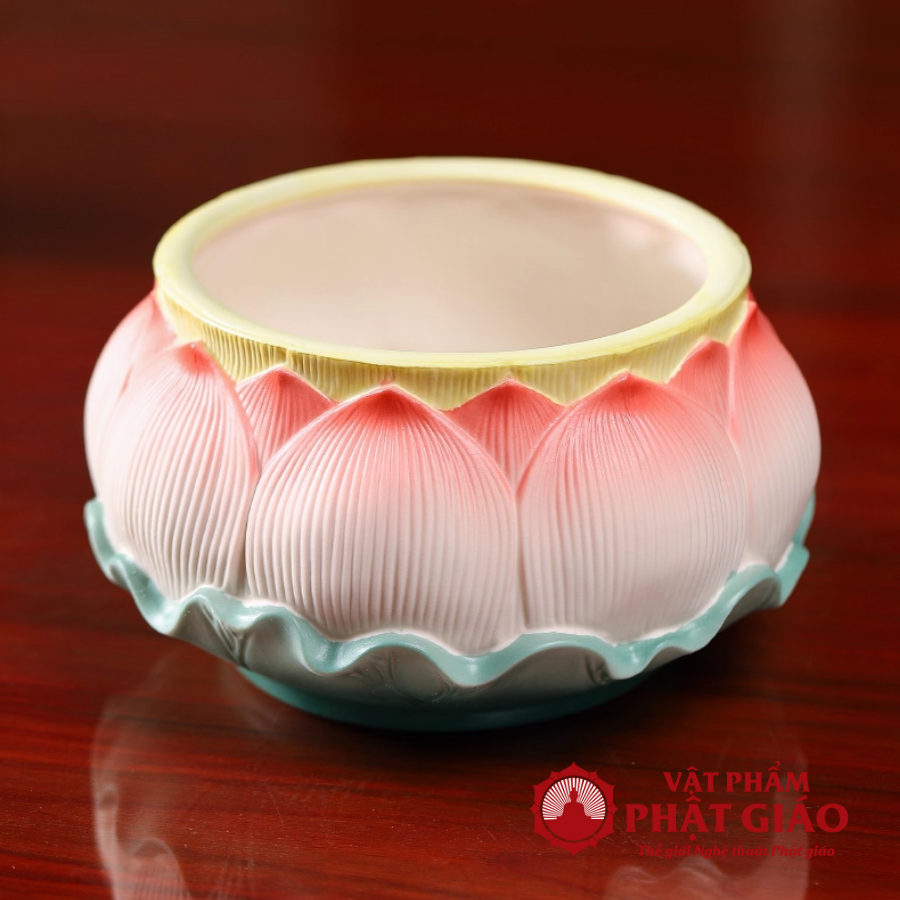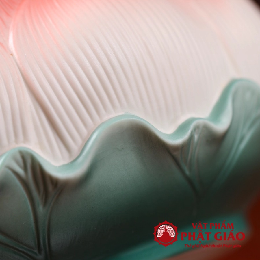 Bát hương (lư hương) được tạo hình theo dáng hoa sen nở mềm mại, đường nét uyển chuyển, kết hợp đế lá sen xanh tinh tế. Hình dáng này không chỉ làm nổi bật vẻ thanh thoát, trang nghiêm mà còn mang đến sự tinh tế cho bàn thờ hiện đại hoặc kết hợp truyền thống – tối giản.
