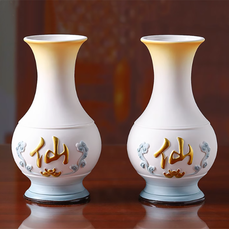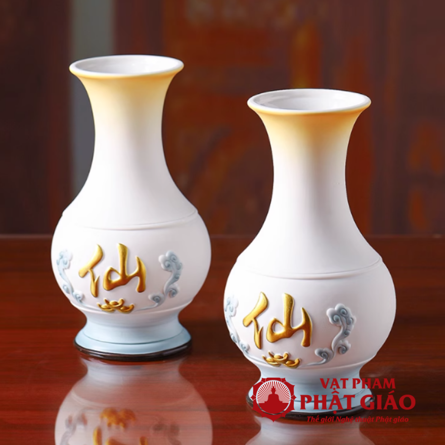 - Viền vàng ánh kim mang ý nghĩa phú quý, viên mãn; đây cũng là chi tiết giúp bình hoa trở nên nổi bật, sang trọng và cân đối khi phối cùng các món thờ cúng khác.