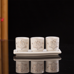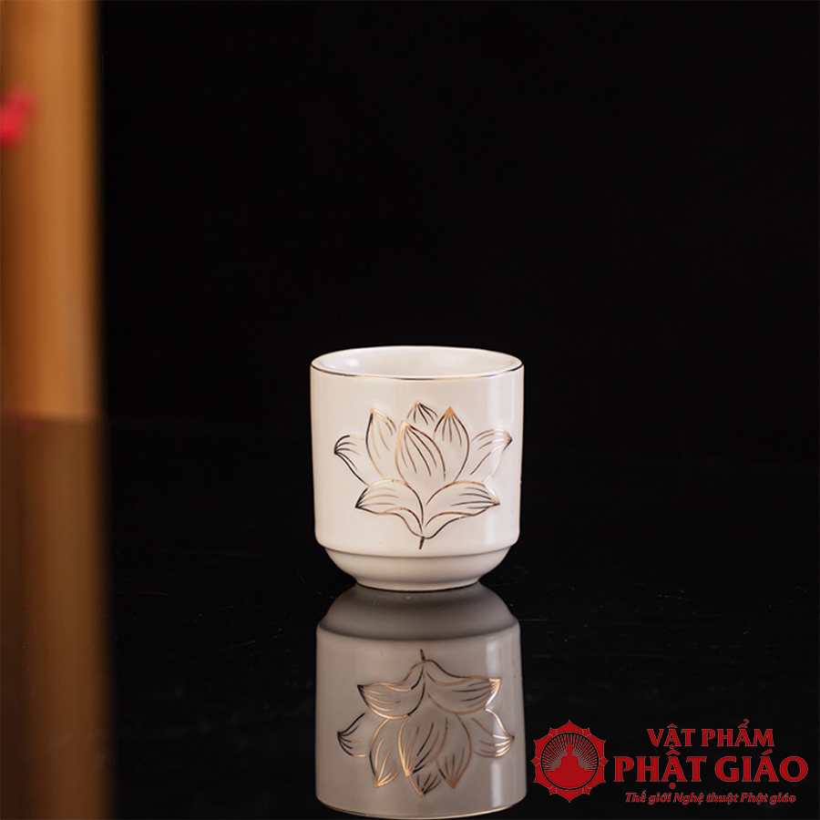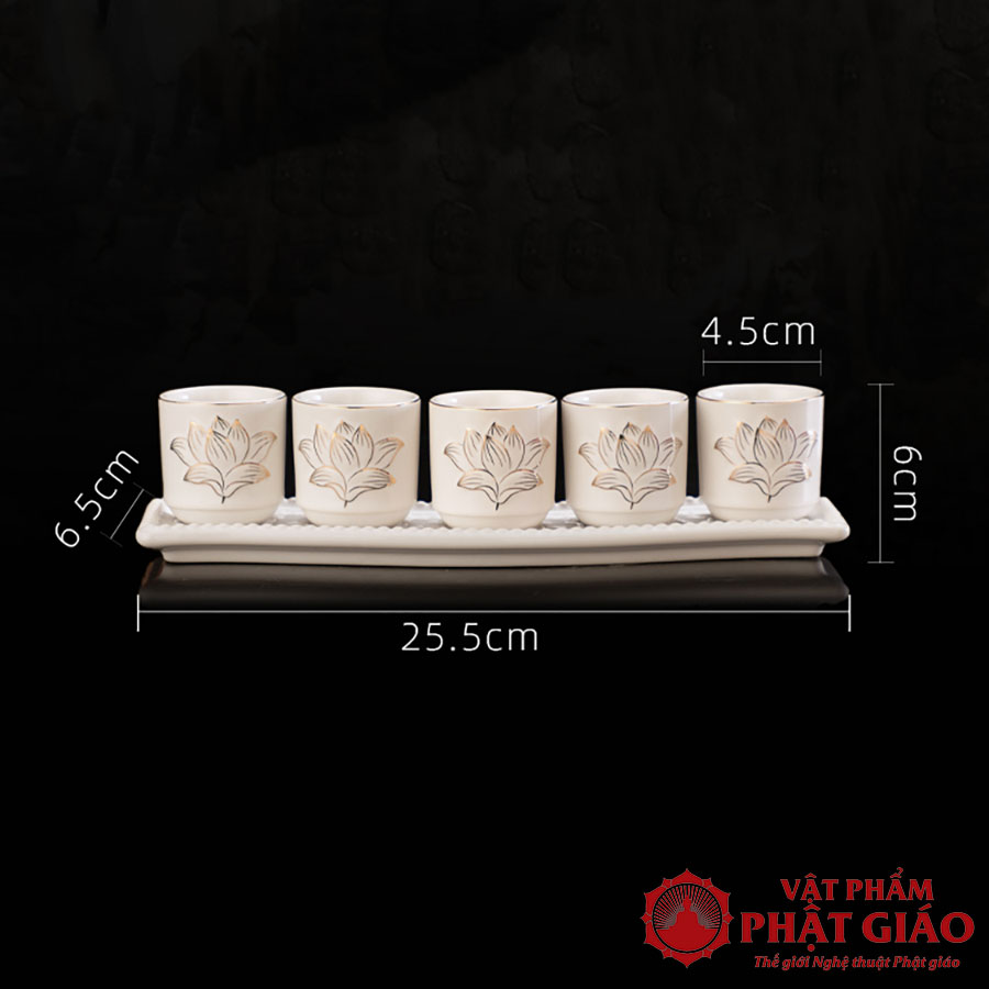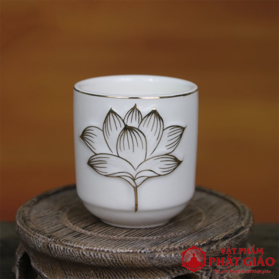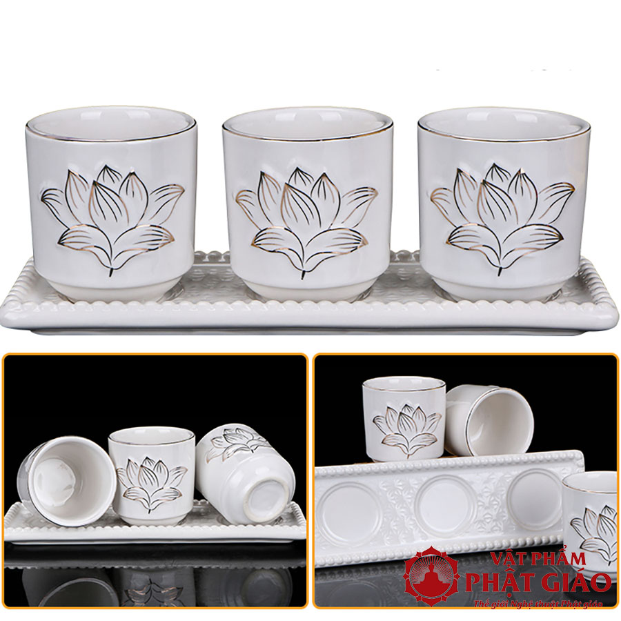 Bộ Chén Nước Thờ Sứ Trắng Hoa Sen Viền Vàng, Bộ 3 Chén, 5 Chén