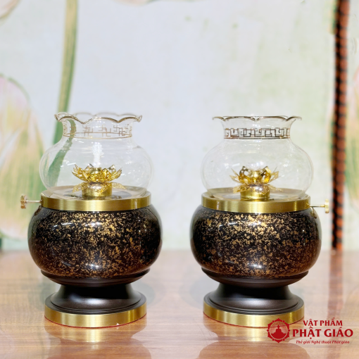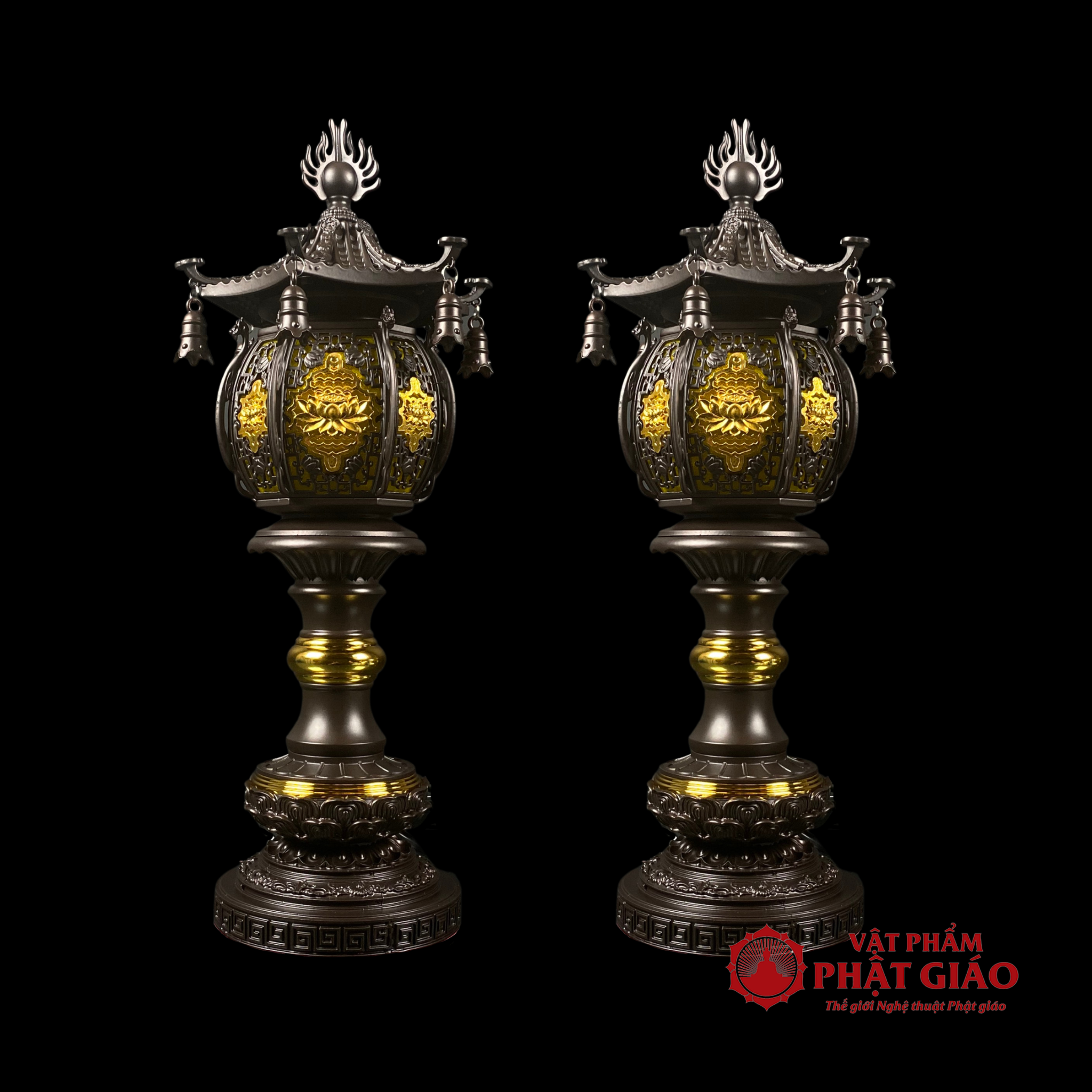 Đôi Đèn Thờ Liên Hoa Mái Chùa, Thân Đồng Dát Vàng, Nhiều Kích Thước