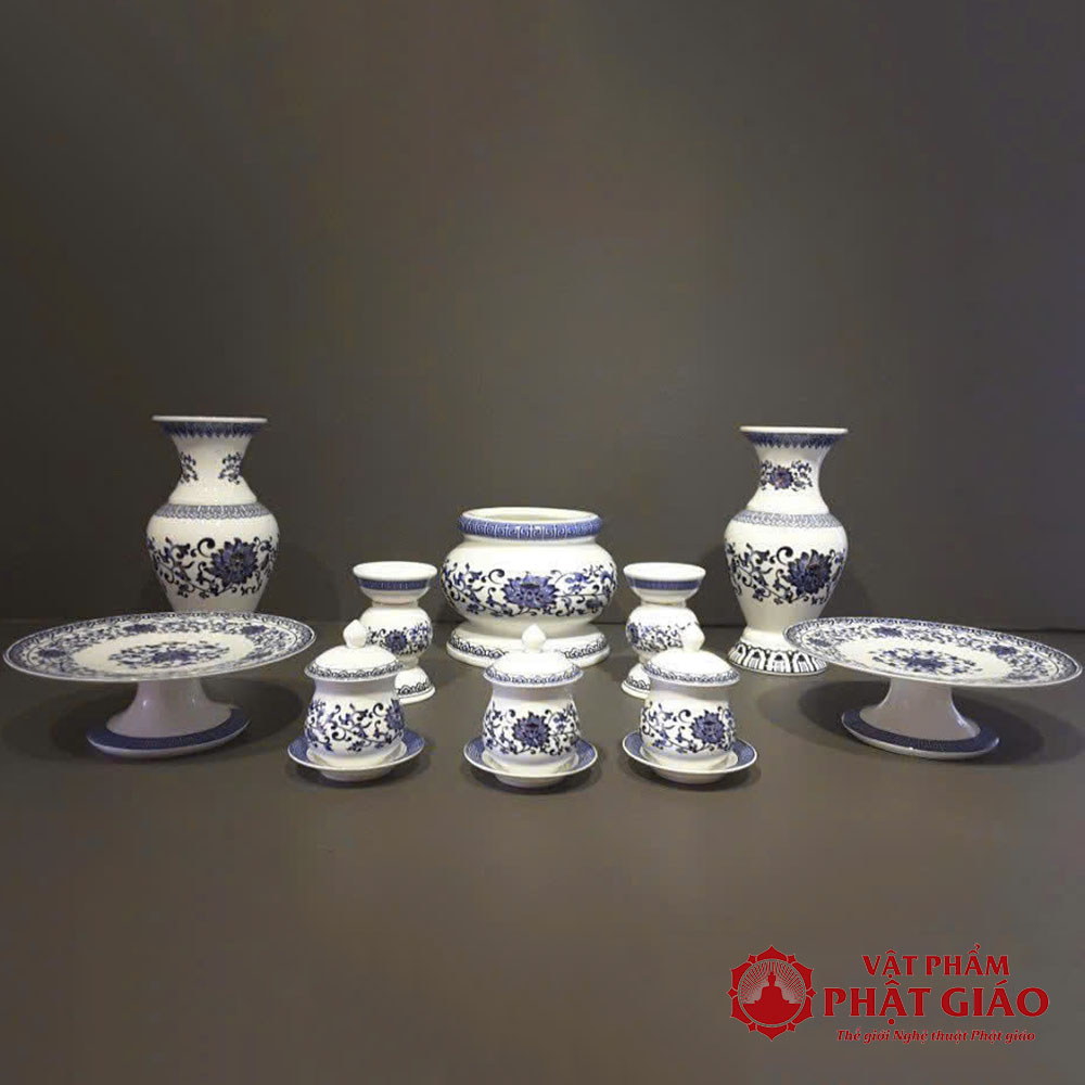 Bộ Đồ Thờ Sứ Trắng Hoa Sen Xanh