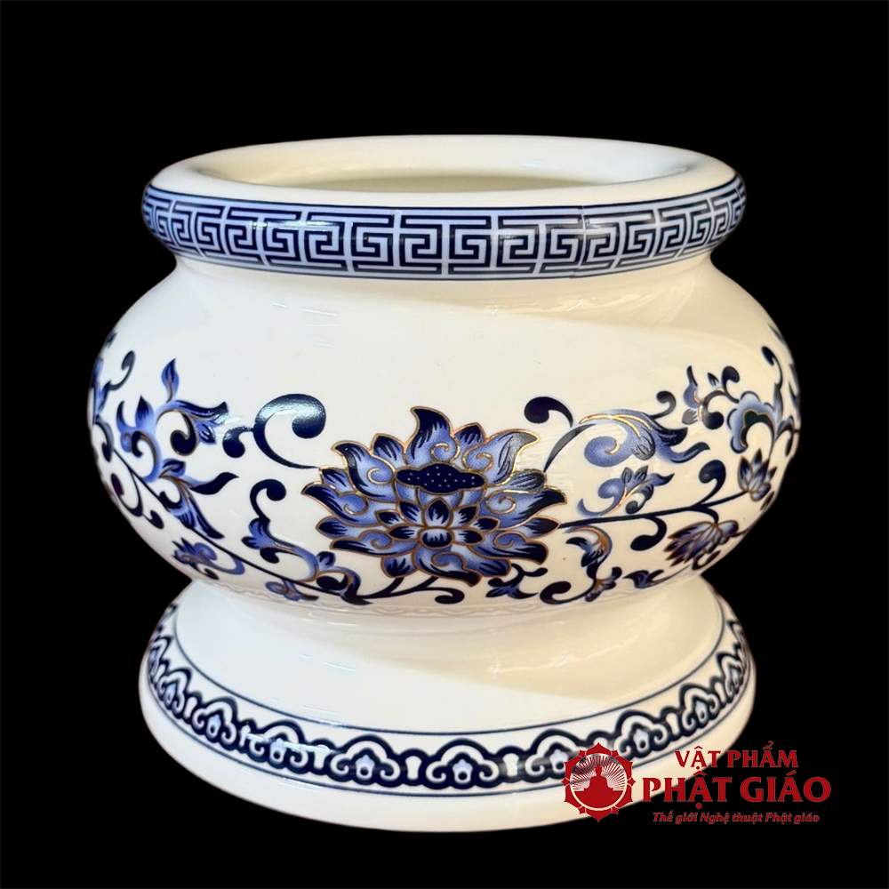 Bát Hương Sứ Trắng Hoa Sen Lam Họa Tiết Cổ, Nhiều Kích Cỡ