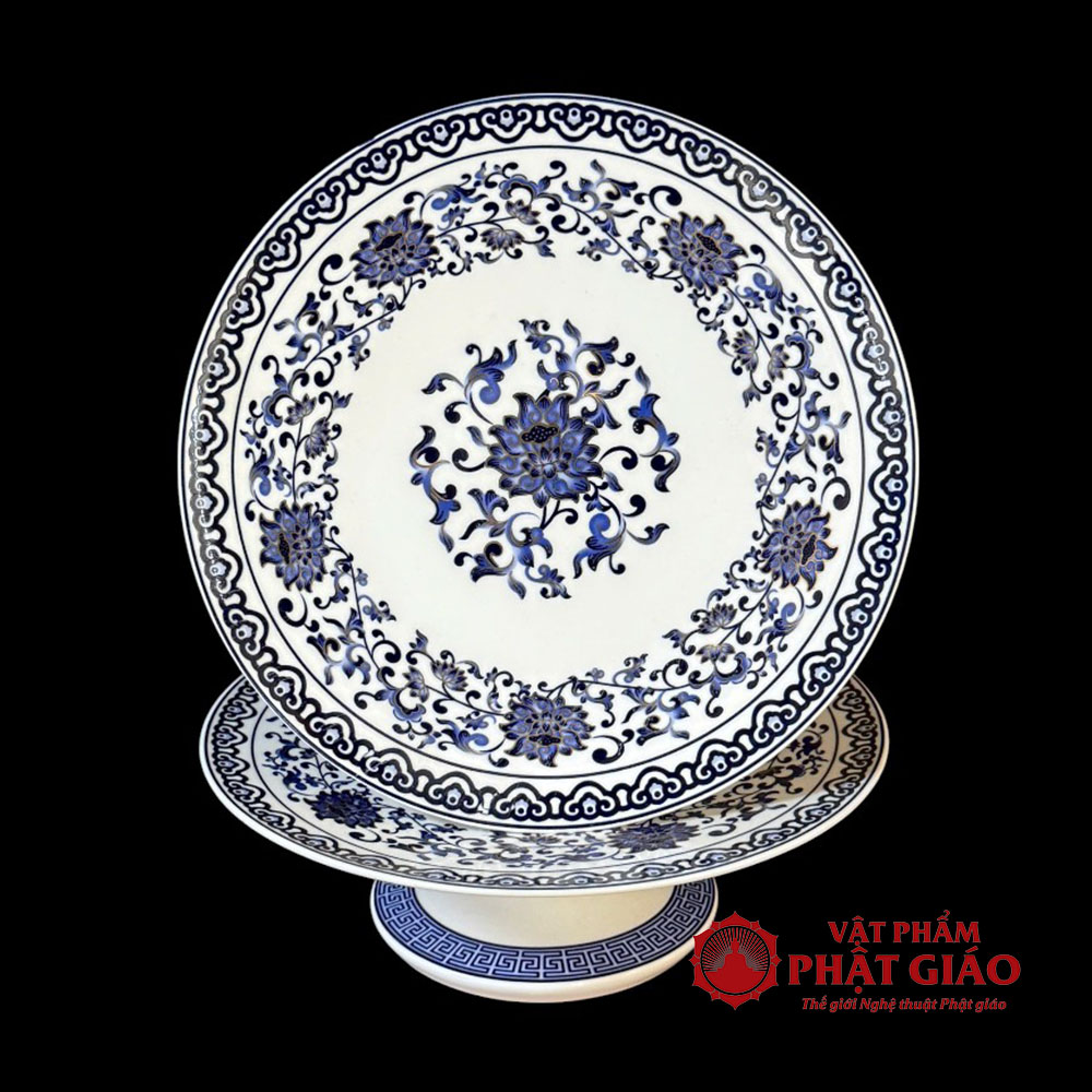 Mâm Bồng Bằng Sứ Trắng Hoa Sen Màu Lam Truyền Thống, Nhiều Kích Cỡ