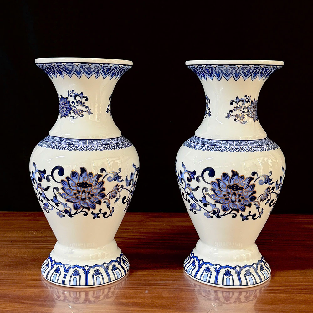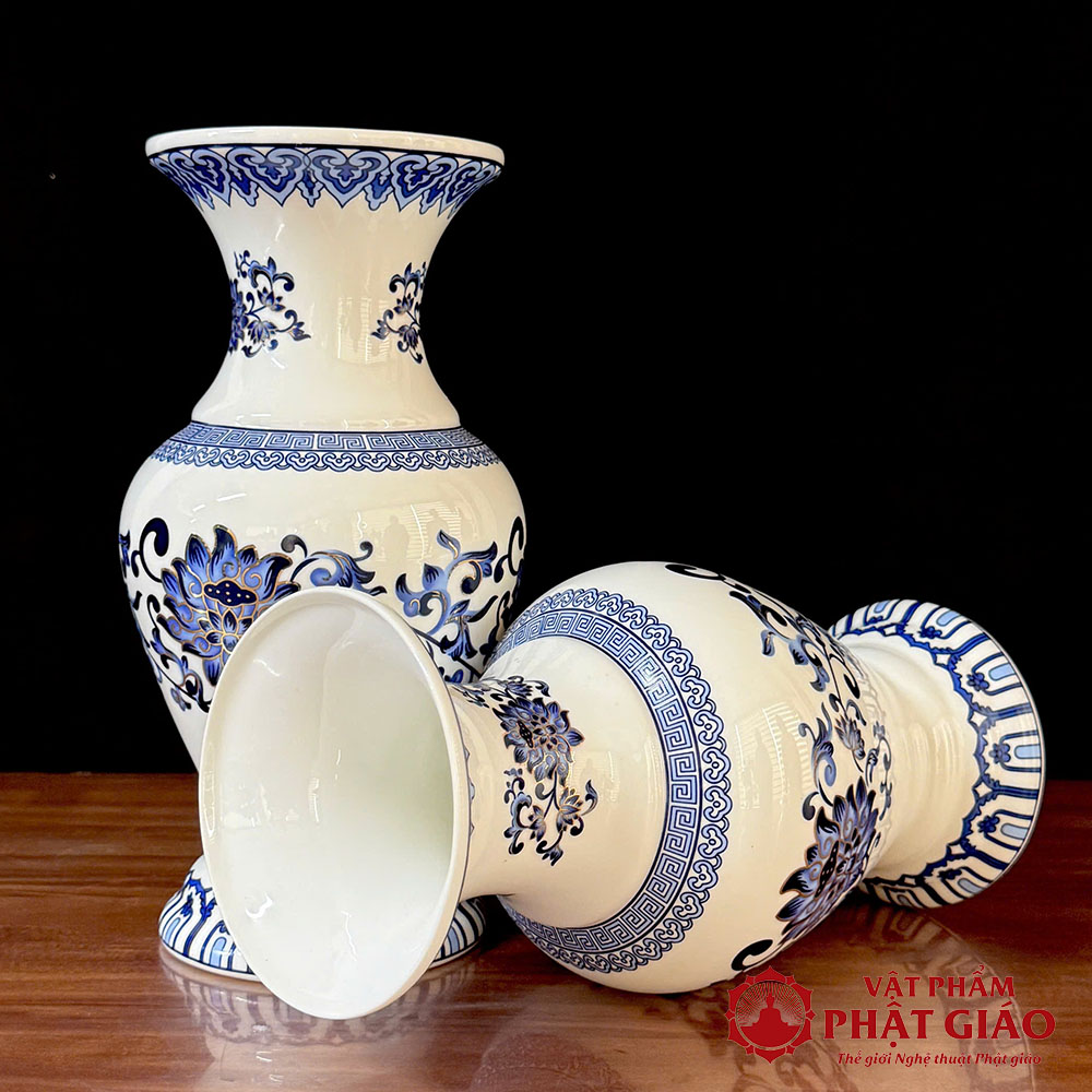 Lọ Hoa Thờ Cúng Sứ Trắng Hoa Sen Màu Lam, Nhiều Kích Cỡ