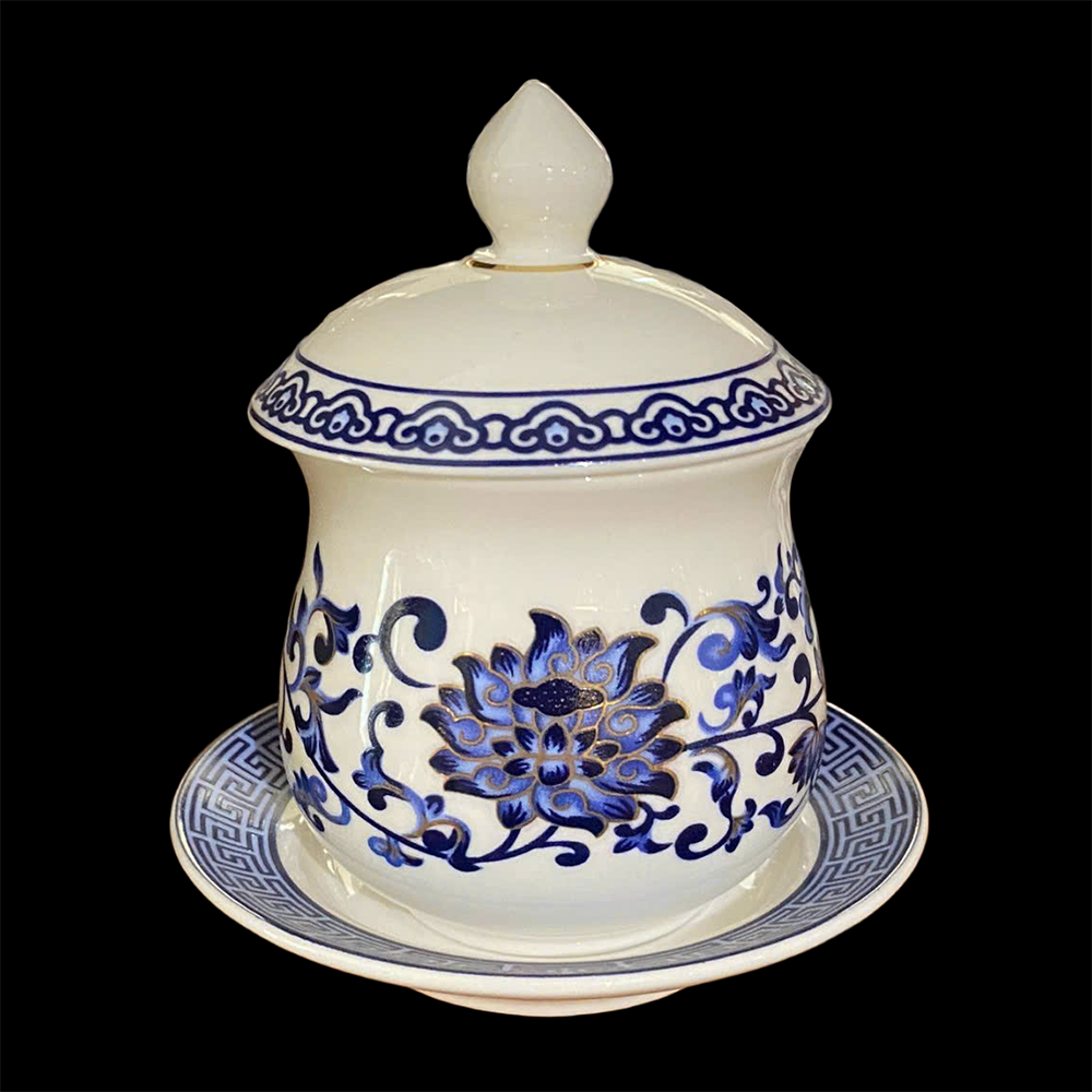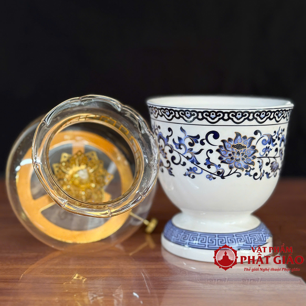 Chén Nước Thờ Sứ Trắng Hoa Sen Màu Lam Họa Tiết Truyền Thống, Nhiều Kích Cỡ