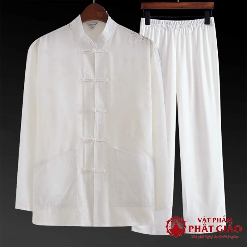 Bộ Quần Áo Cư Sĩ Nam Dài Tay Vải Dệt Kim Màu Trắng