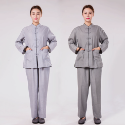 Bộ quần áo nữ Phật tử, cư sĩ dài tay vải xô được thiết kế theo phong cách truyền thống, vừa thanh lịch vừa trang nghiêm. Gam màu xám đậm và xám nhạt nhã nhặn, phù hợp cho các buổi lễ chùa, tụng kinh, thiền định và các khóa tu Phật giáo.