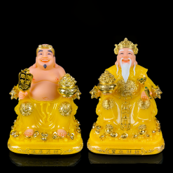 Bộ tượng Thần Tài – Thổ Địa được chế tác từ bột đá thạch anh cao cấp, phủ lớp sơn vàng óng ánh kết hợp viền vàng tinh xảo, mang đến vẻ đẹp sang trọng và quý khí. Hình tượng hai vị thần với nụ cười hoan hỷ, tay nâng thỏi vàng, gậy như ý và thẻ chiêu tài, tượng trưng cho phúc lộc viên mãn – tài vận hanh thông – gia đạo hưng thịnh.