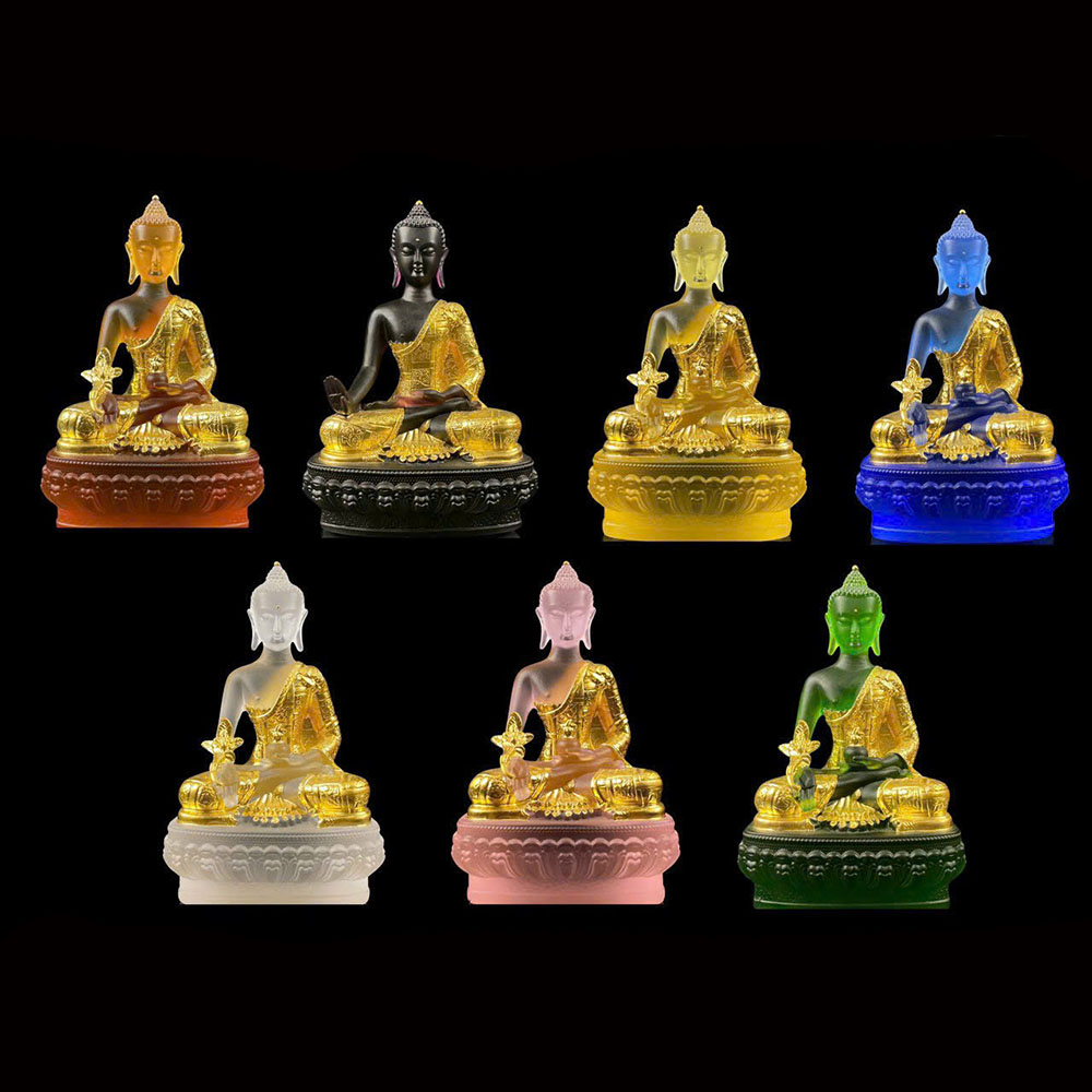 Bộ tượng Thất Phật Dược Sư được chế tác từ chất liệu lưu ly cao cấp, thân tượng dát vàng tinh xảo, tỏa sáng linh diệu trong bảy màu sắc thanh tịnh. Mỗi tôn tượng thể hiện thủ ấn ban dược, tay cầm cành thuốc tiêu biểu cho trí tuệ và năng lực chữa lành của chư Phật.