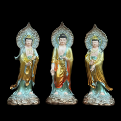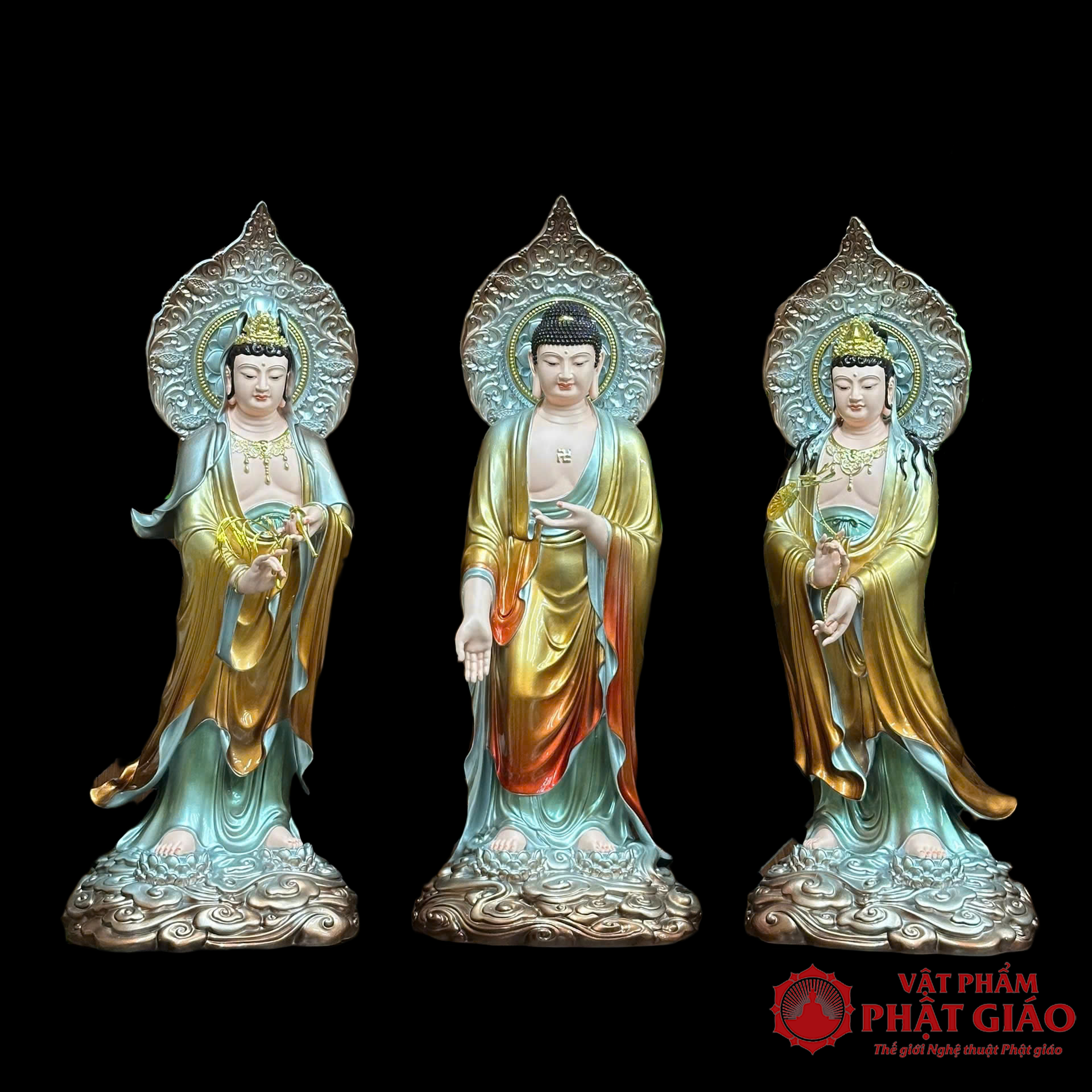 Bộ tượng Tây Phương Tam Thánh gồm: Đức Phật A Di Đà đứng giữa, hai bên là Bồ Tát Quán Thế Âm và Đại Thế Chí, tạo thành biểu tượng cao quý của pháp môn Tịnh độ – tiếp dẫn chúng sinh vãng sinh Cực Lạc.