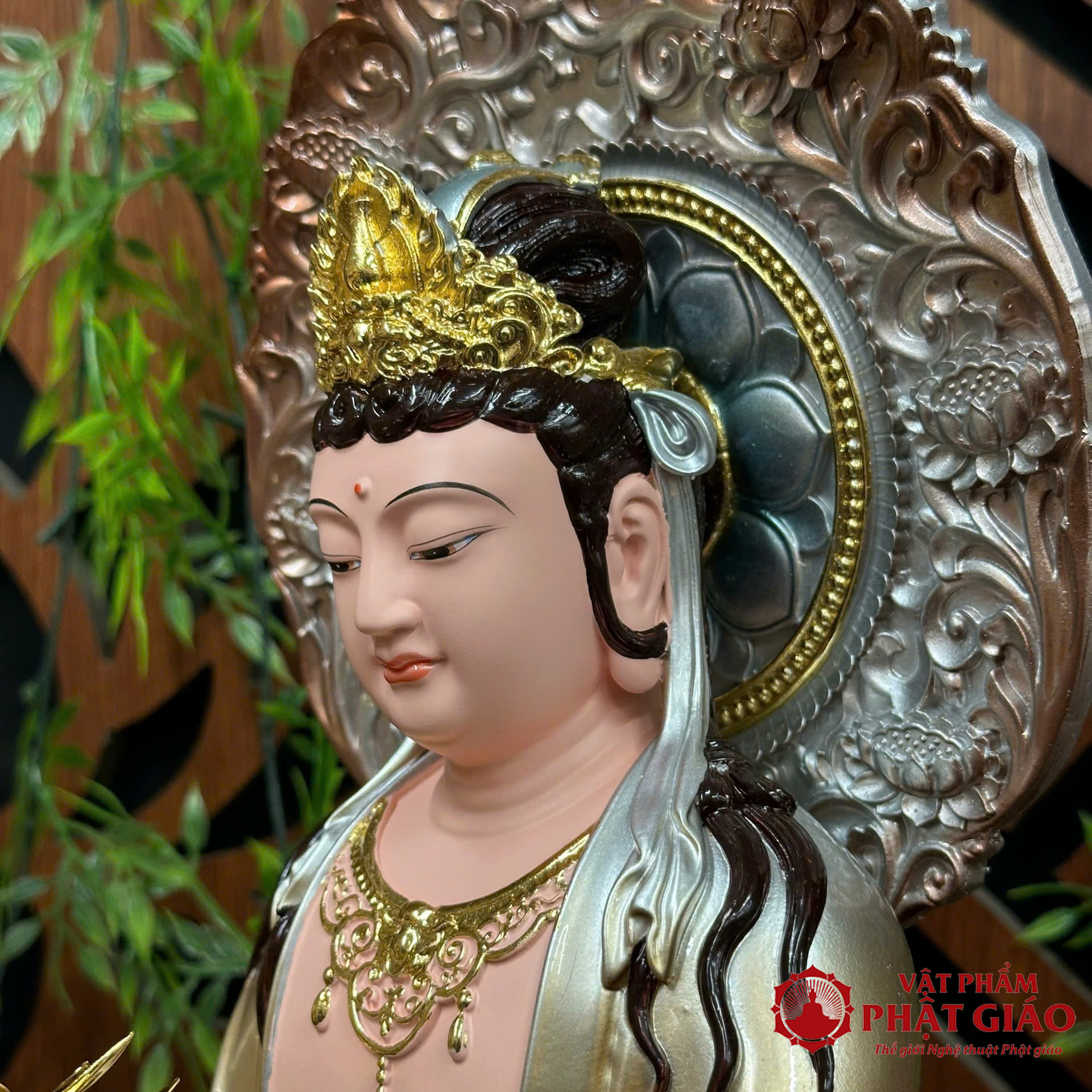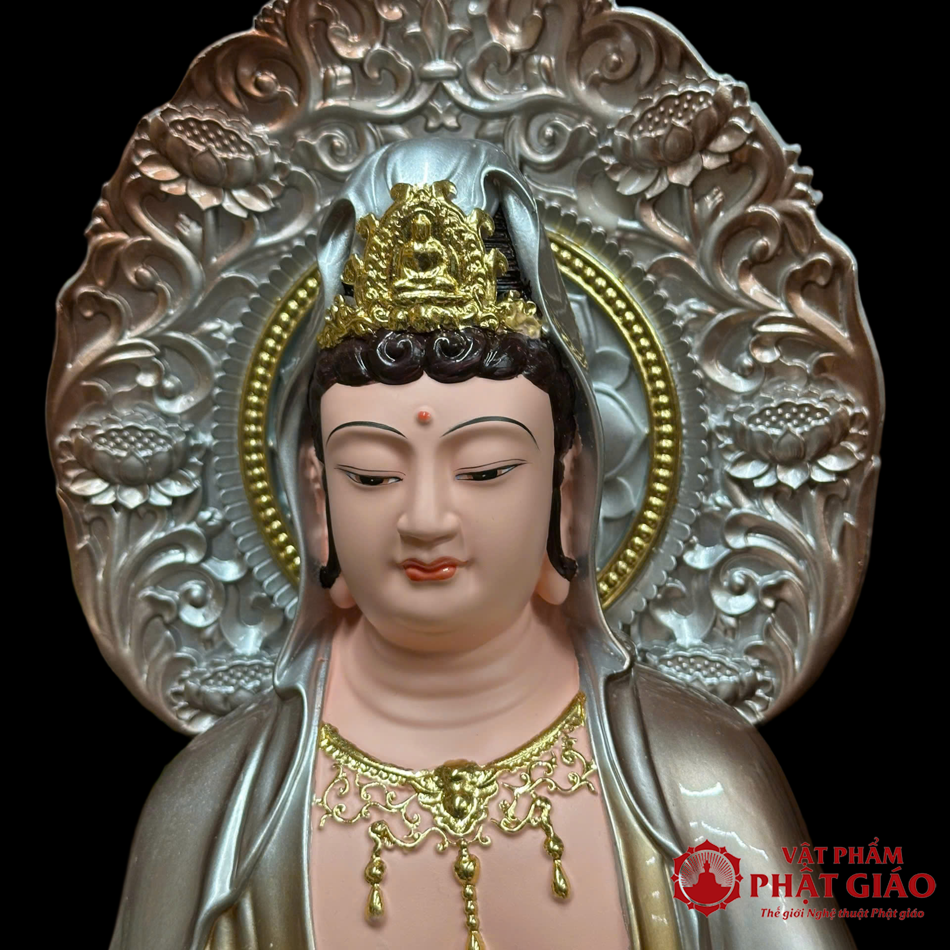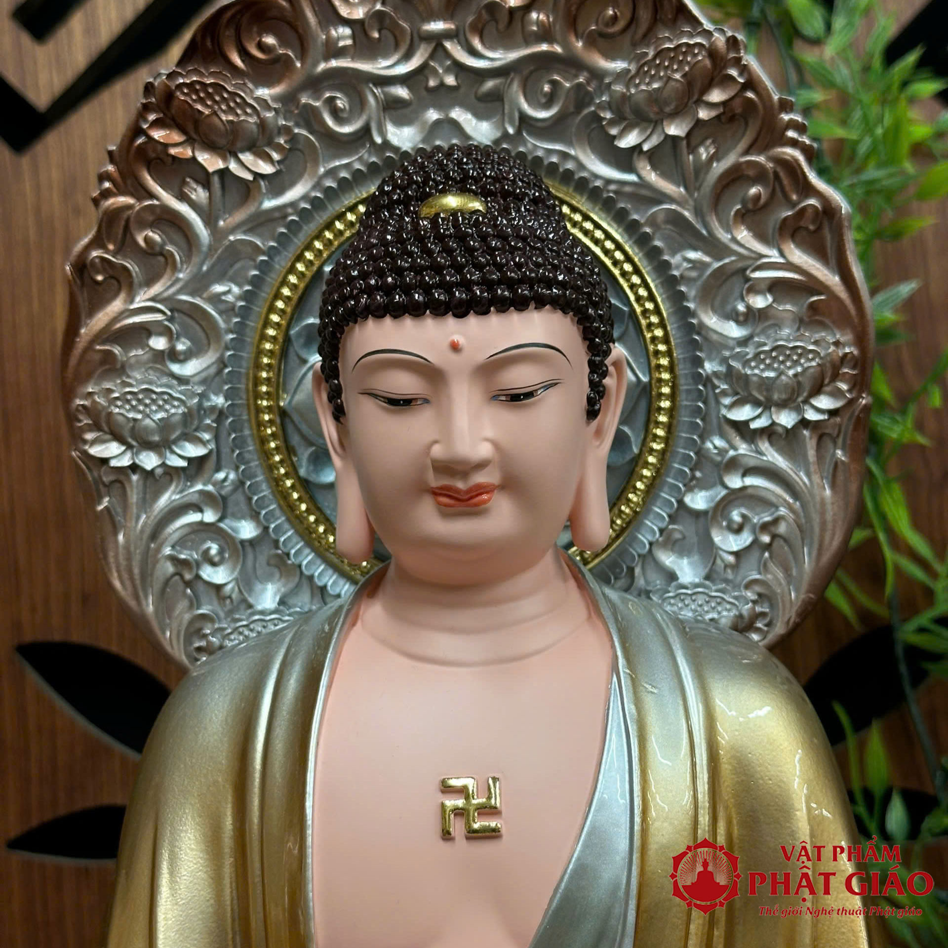 Chất liệu: Tượng được chế tác từ composite cao cấp, phủ sơn bóng mịn và sắc nét, từng chi tiết trên y phục, đài sen, và pháp tướng đều được thể hiện tinh xảo. Màu sắc hài hòa, bền đẹp theo thời gian, thể hiện rõ nét vẻ từ bi và thanh tịnh của ba đức tôn tượng.