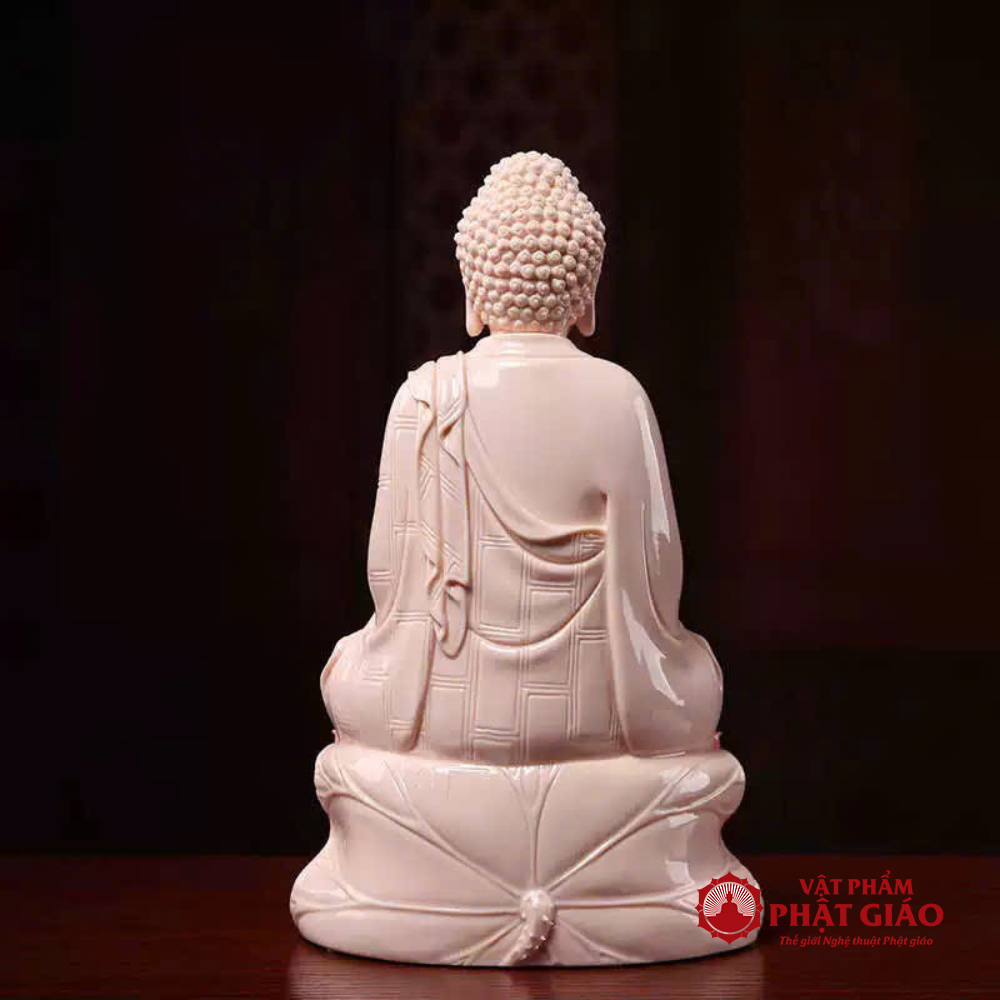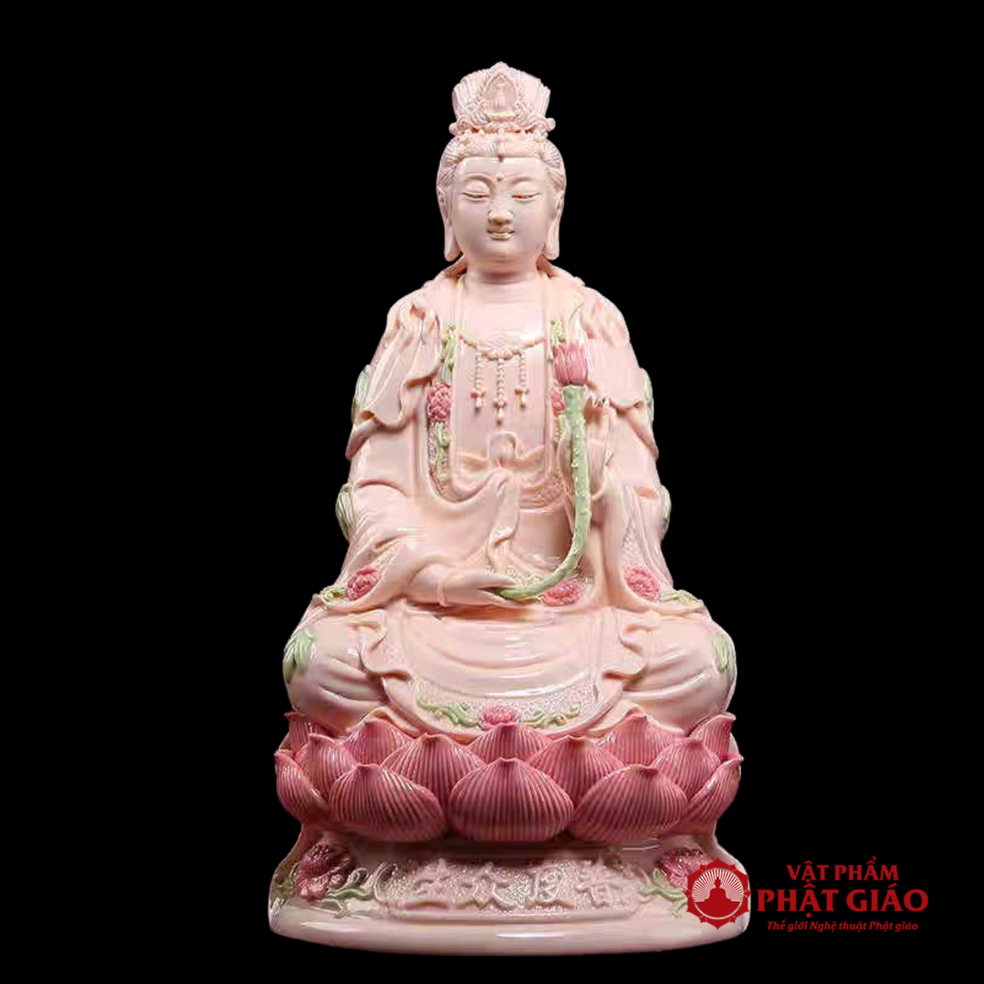 Đế sen: Tượng ngồi trên tòa sen lớn màu hồng, chi tiết sắc nét, tôn lên sự thanh tịnh và cao quý.