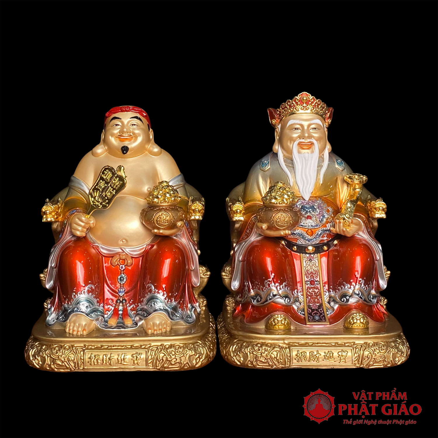 Bộ tượng Thần Tài – Thổ Địa được chế tác từ đồng nguyên chất cao cấp, phủ lớp sơn đỏ ánh kim sang trọng, kết hợp hoa văn vàng tinh xảo. Hai vị thần được thể hiện với thần thái phúc hậu, uy nghi, tượng trưng cho tài lộc – may mắn – an cư – thịnh vượng.