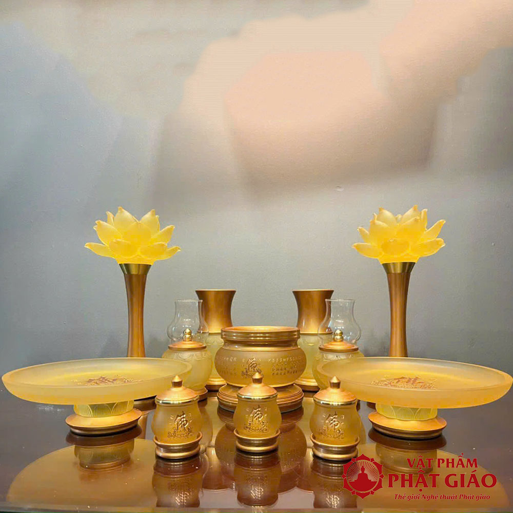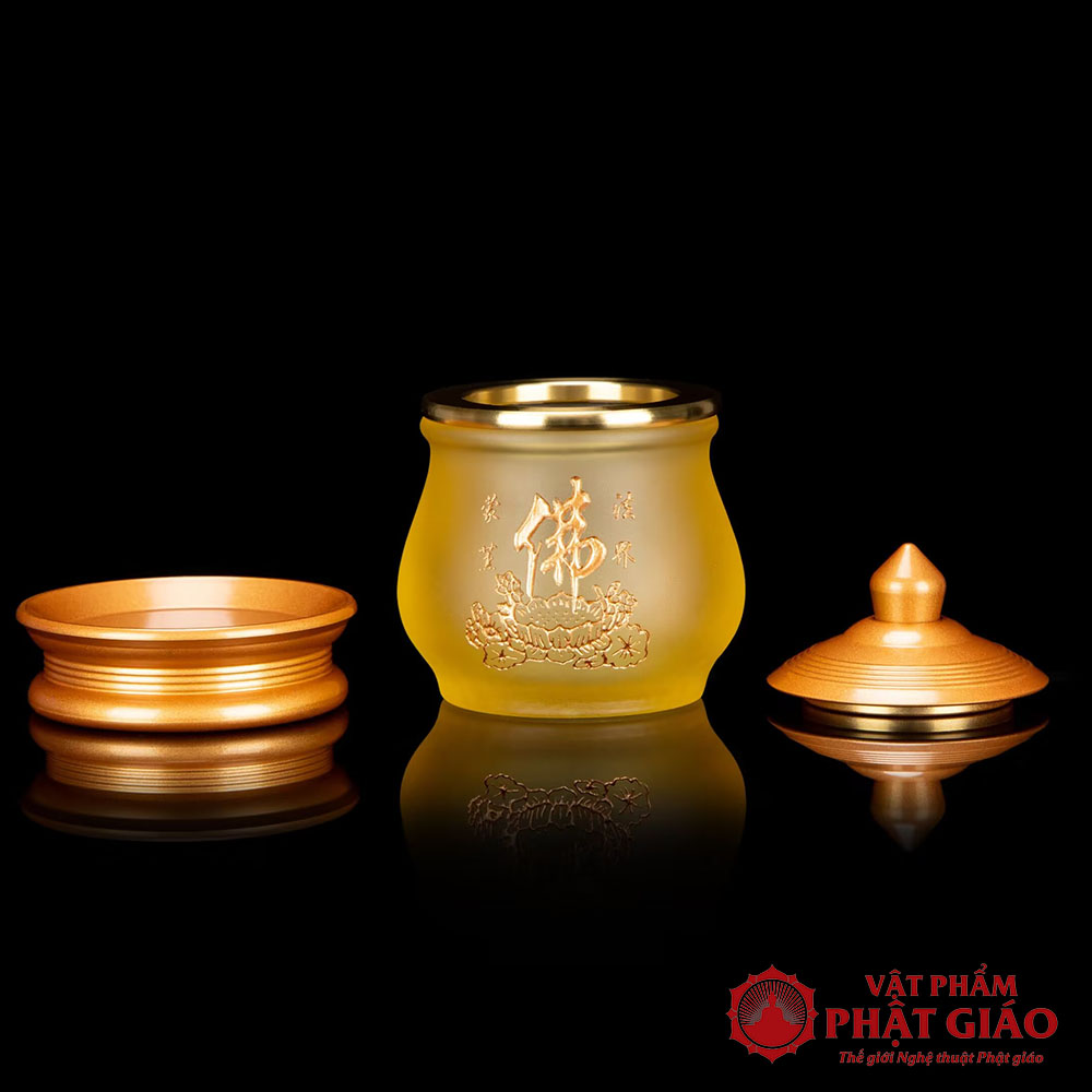 Chén Nước Thờ Cao Cấp Bằng Lưu Ly Chữ Phật Hoa Sen Bọc Đồng Cao 8cm