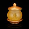 Chất liệu: Thân chén bằng lưu ly vàng nhạt, nắp và đế bằng đồng mạ vàng