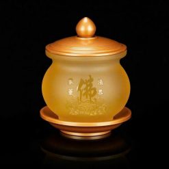 Chất liệu lưu ly được xem là biểu tượng của trí tuệ, thanh tịnh và từ bi trong Phật giáo. Khi kết hợp cùng chữ “Phật” và họa tiết đài sen, chén nước không chỉ dùng để dâng cúng mà còn mang ý nghĩa thanh lọc vọng niệm, nuôi dưỡng sự an định và phước báu. Việc dâng nước bằng chén lưu ly là hành động cúng dường thanh cao, thể hiện tâm thành hướng về Tam Bảo.