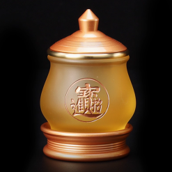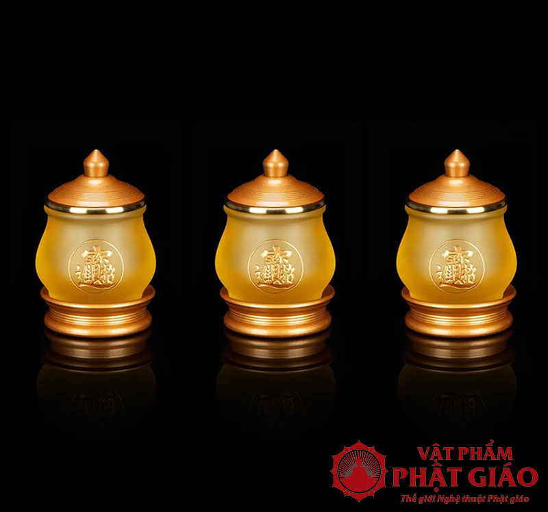 Chén thờ được chế tác từ lưu ly mờ cao cấp phối hợp cùng đế và nắp đồng mạ vàng sang trọng. Hình dáng miệng chén mở rộng giúp tụ khí tài lộc, thân chén khắc nổi chữ Chiêu Tài (招財) mang ý nghĩa thu hút tiền tài, vận may và năng lượng thịnh vượng cho gia chủ.