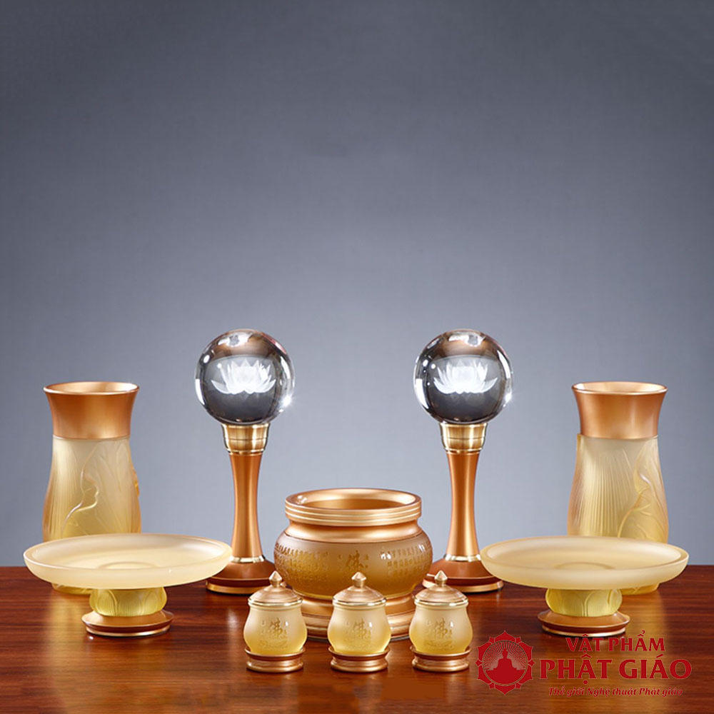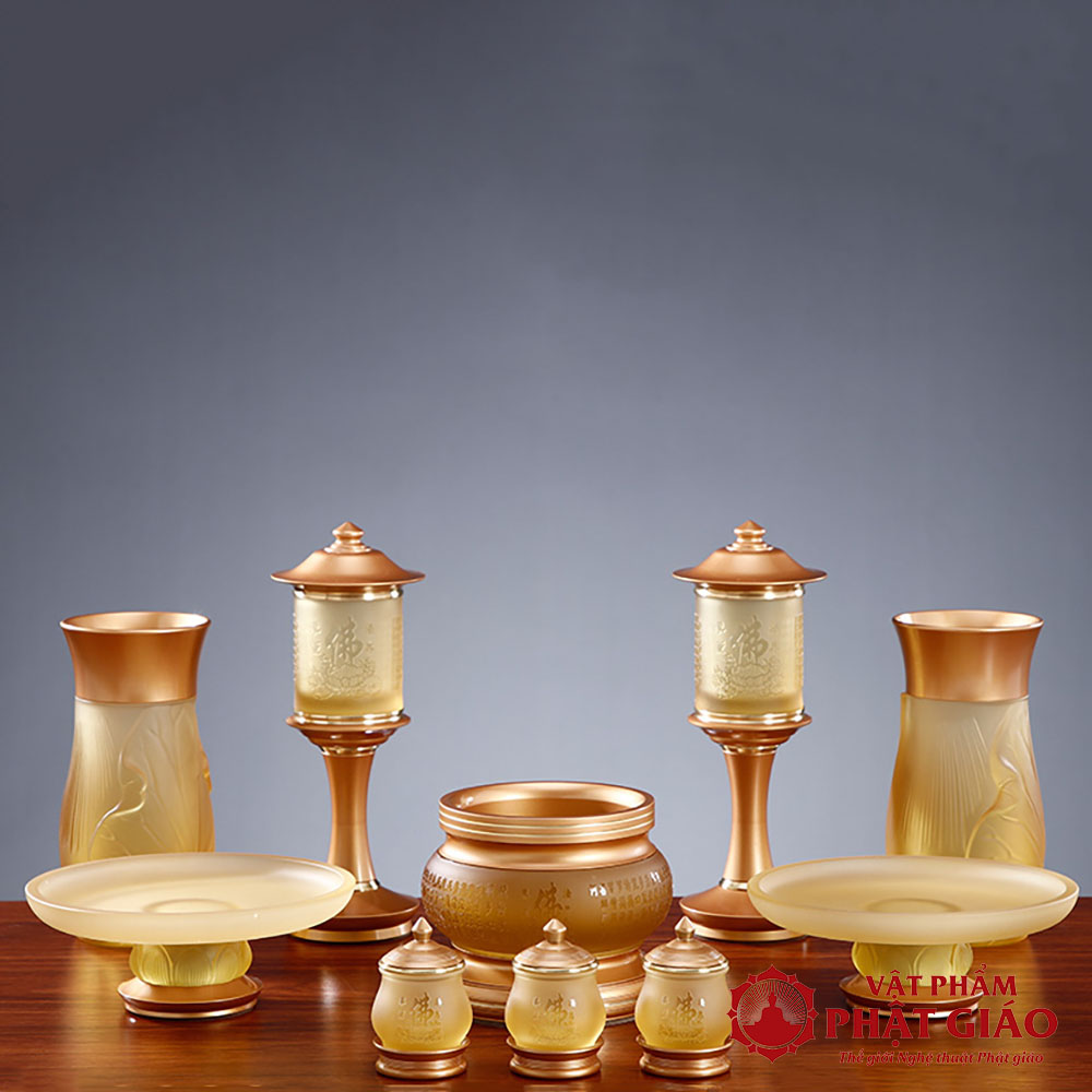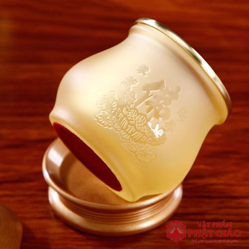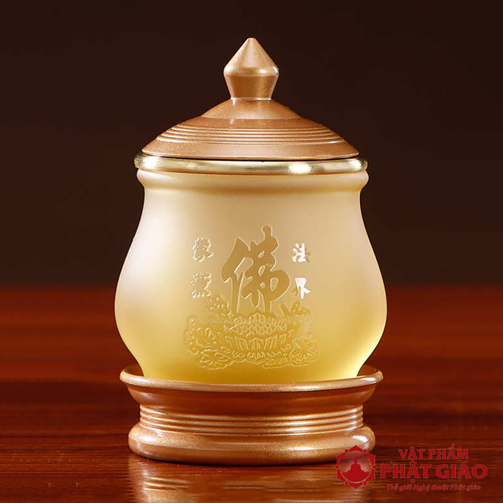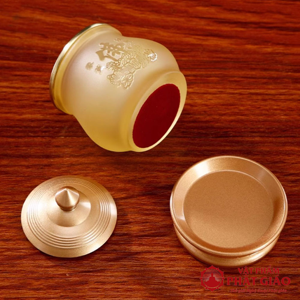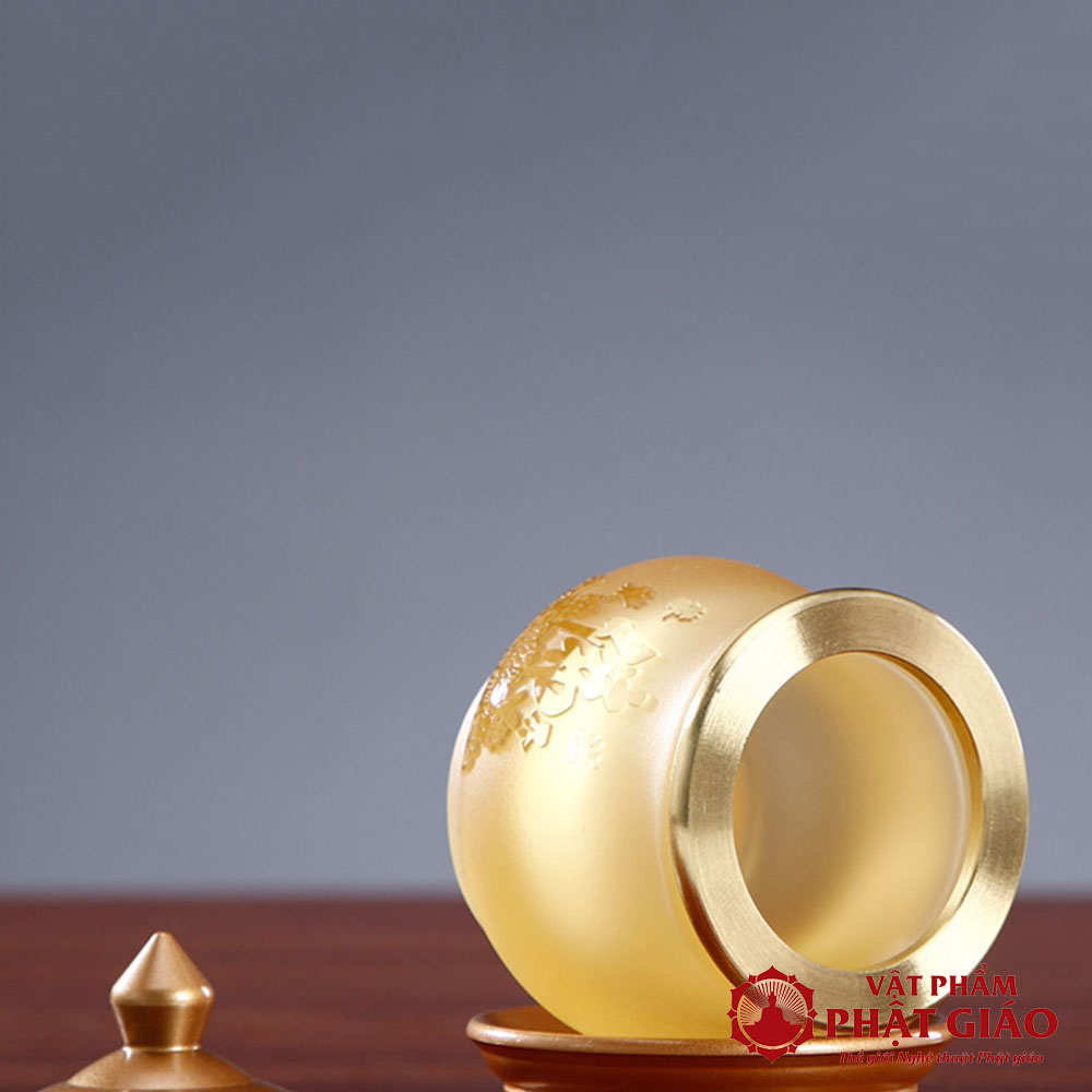 Chén thờ được chế tác tinh xảo từ chất liệu lưu ly mờ phối hợp cùng đế và nắp bằng đồng mạ vàng, tạo nên tổng thể hài hòa và trang trọng. Mặt trước chén khắc chữ Phật (佛) cùng họa tiết hoa sen cách điệu, biểu trưng cho sự thanh tịnh, giác ngộ và niềm kính ngưỡng sâu sắc với Tam Bảo.