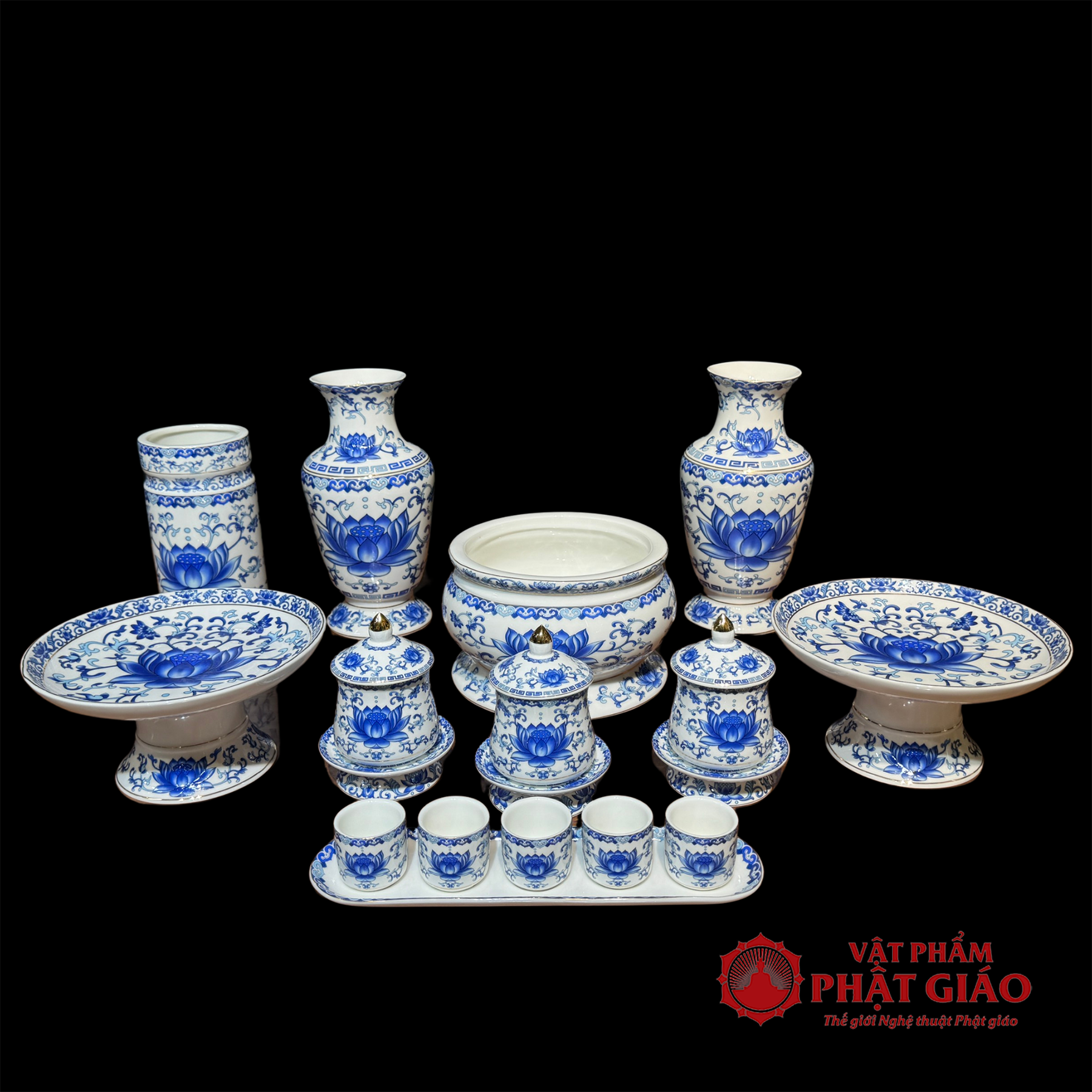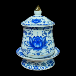 Cốc nước thờ sứ trắng hoa sen xanh tượng trưng cho sự thanh tịnh, khiêm cung và lòng thành trong nghi thức dâng nước. Hình ảnh hoa sen xanh – biểu trưng của trí tuệ và sự thanh lọc – giúp không gian thờ trở nên trang nghiêm, thanh khiết, đồng thời mang năng lượng bình an đến gia đình.