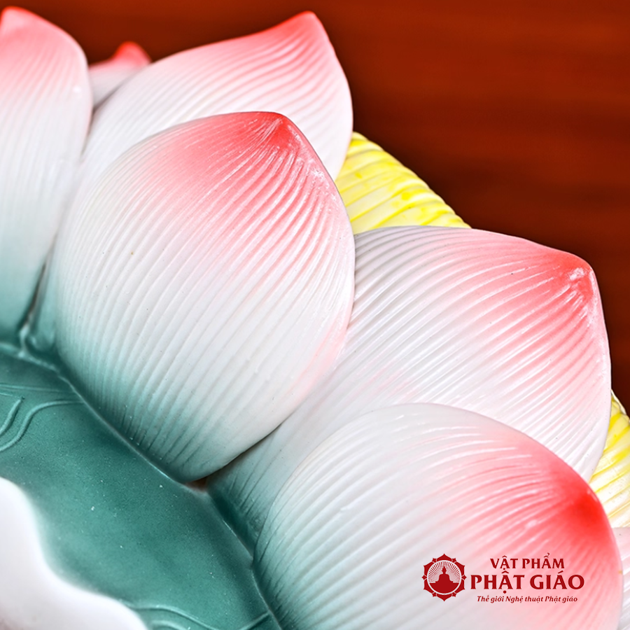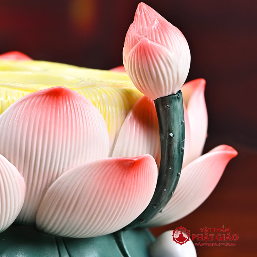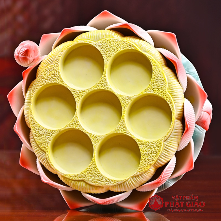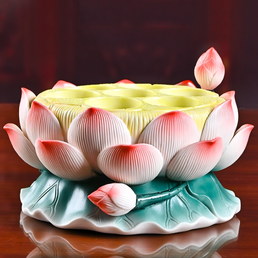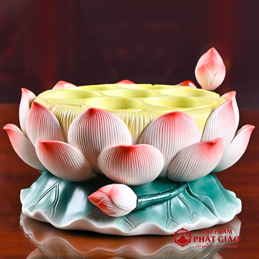 Thiết kế đế vững chắc, phần lõm giữa phù hợp để đặt nến tealight, nến dầu hoặc đèn LED nhỏ, tạo ánh sáng ấm áp, thanh tịnh cho không gian thờ tự. Khi thắp nến, ánh sáng lan tỏa qua từng cánh sen, tạo hiệu ứng lung linh, biểu trưng cho ánh sáng từ bi soi rọi tâm hồn.