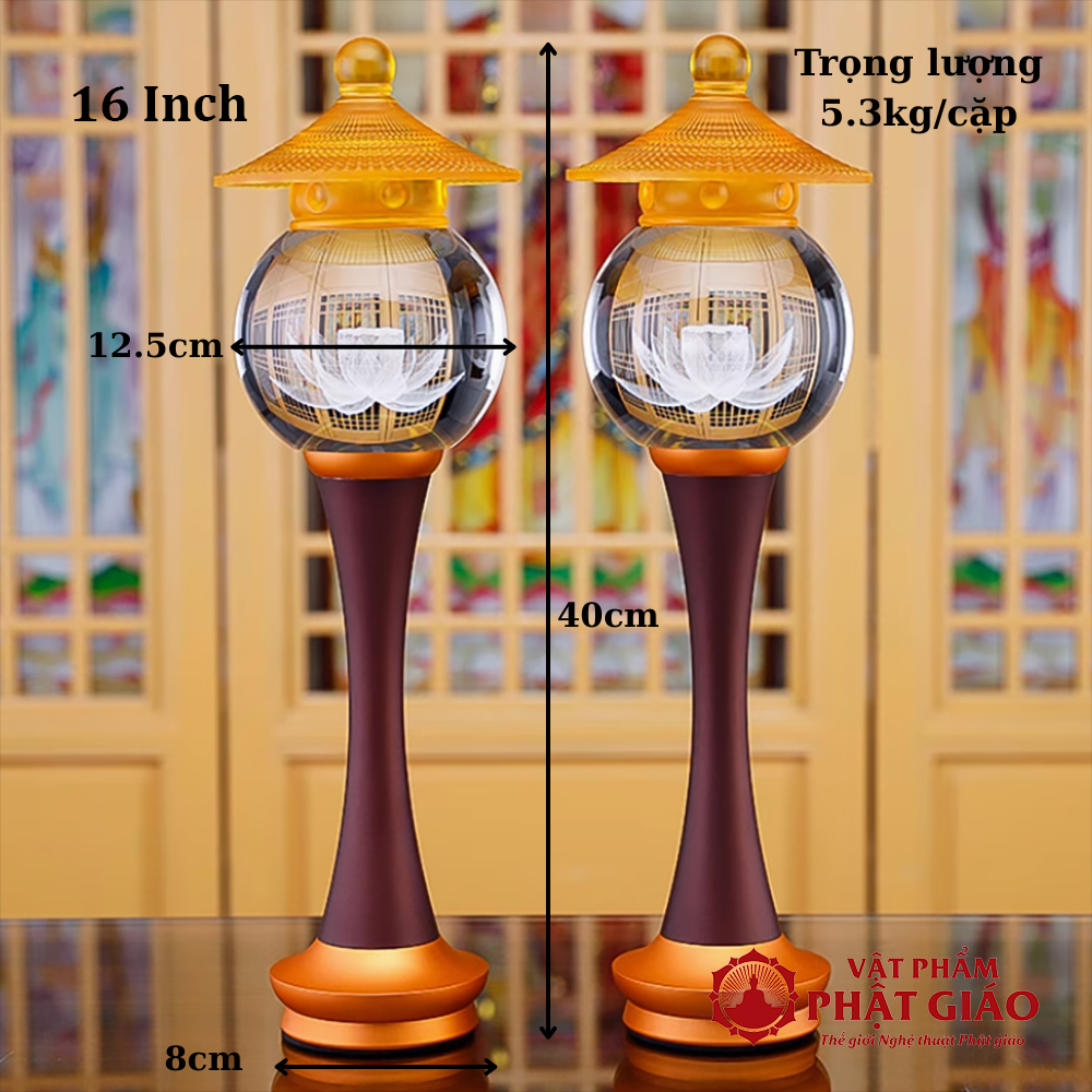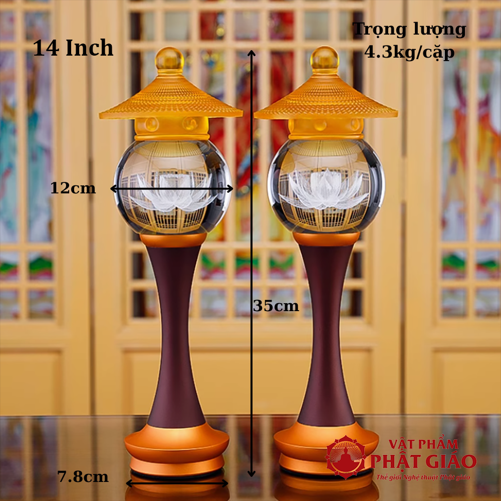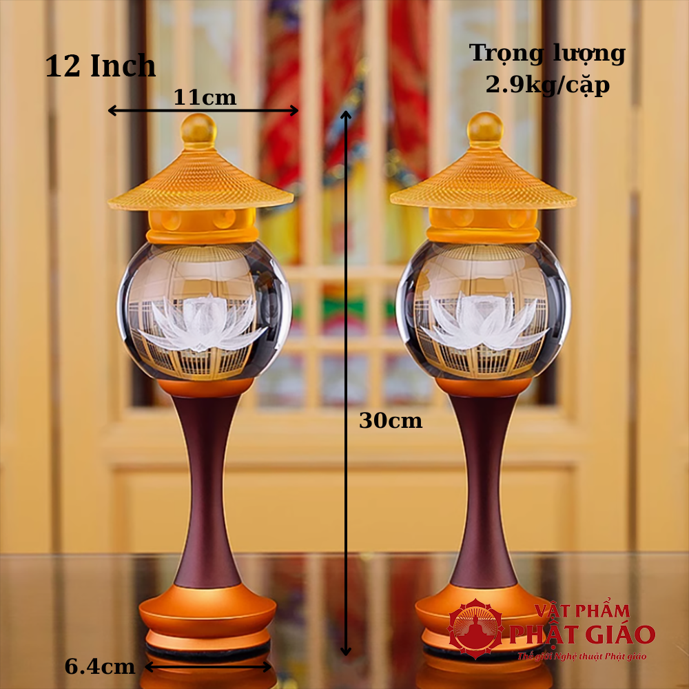 → 22cm – 24cm – 30cm – 35cm – 40cm – 48cm - Ứng dụng: Phù hợp đặt hai bên bàn thờ Phật, bàn thờ Quan Âm, bàn thờ gia tiên, hoặc trong điện thờ chùa chiền. Với nhiều kích thước, đèn có thể kết hợp linh hoạt với tượng, bàn thờ đứng, bàn thờ treo, kệ thờ…