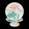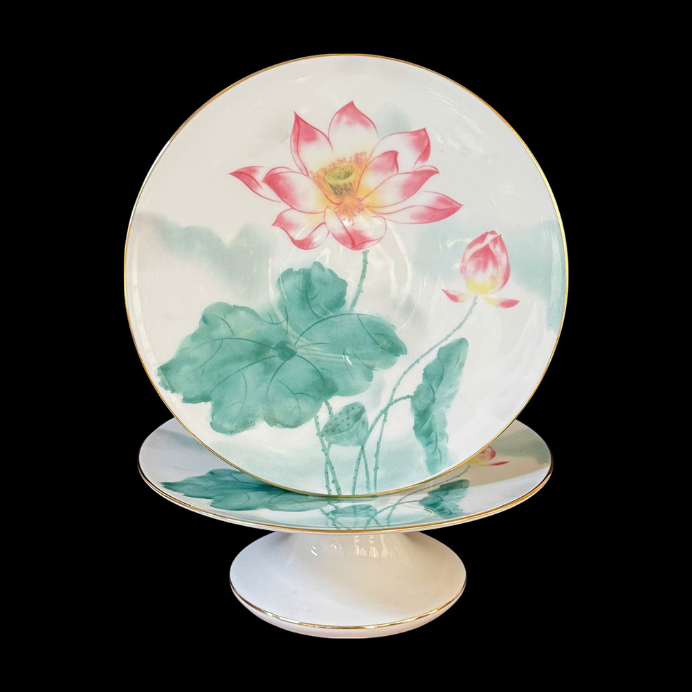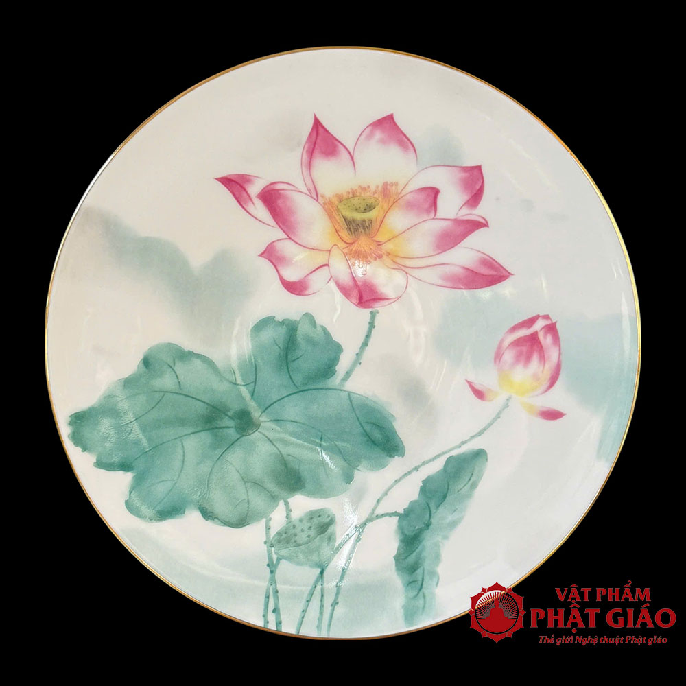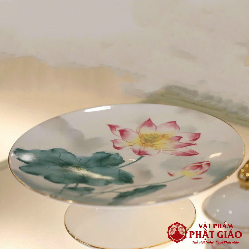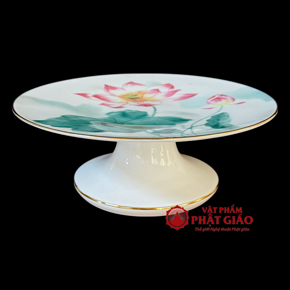Đĩa Thờ Sứ Trắng Họa Tiết Hoa Sen Hồng Lá Xanh, Nhiều Kích Cỡ