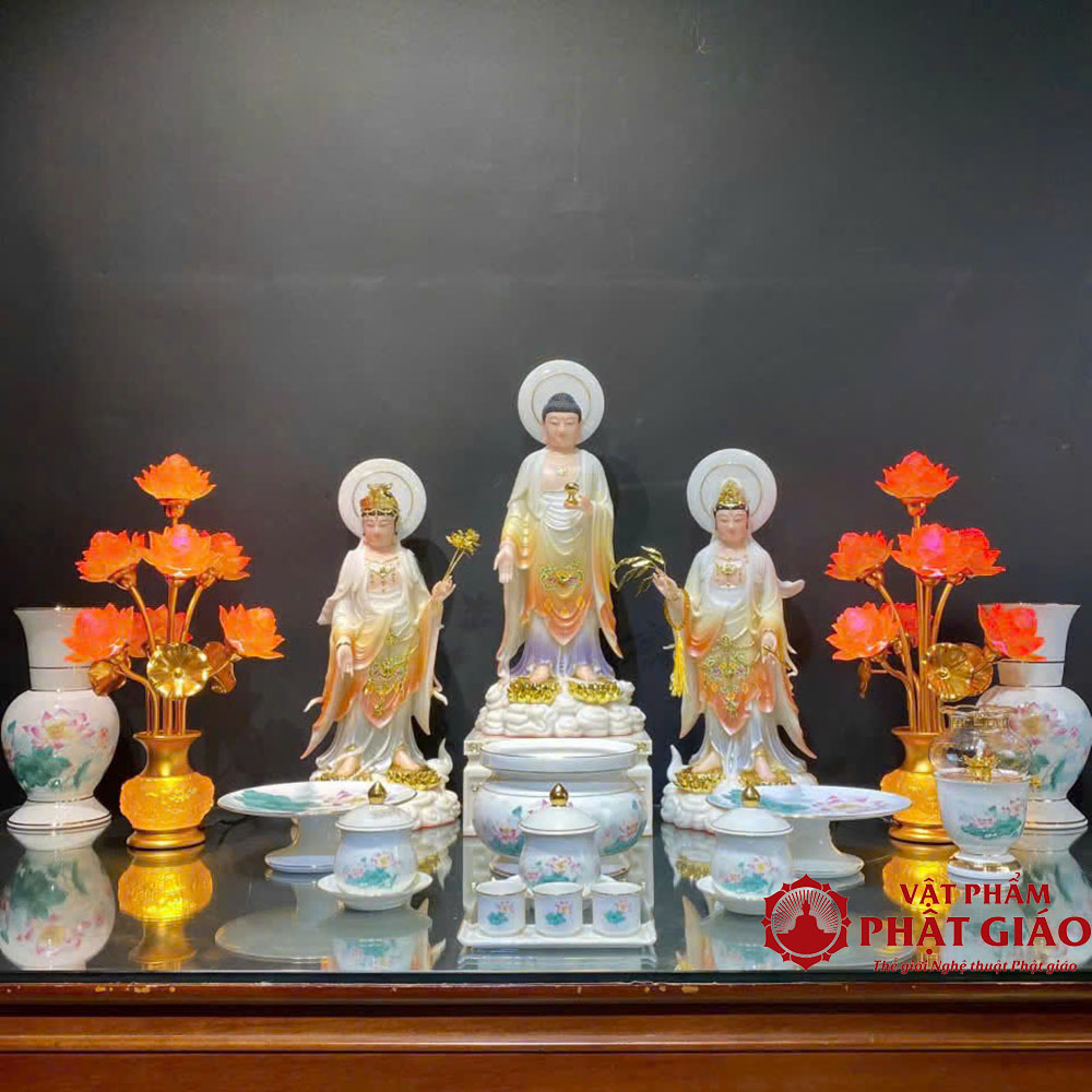 Hoa sen là biểu tượng cao quý trong đạo Phật, tượng trưng cho sự thuần khiết, tỉnh thức và giác ngộ giữa đời ô trọc. Hình ảnh sen hồng nở giữa nền sứ trắng thể hiện tâm thanh tịnh, giúp không gian thờ cúng thêm phần thanh cao và trang nghiêm.