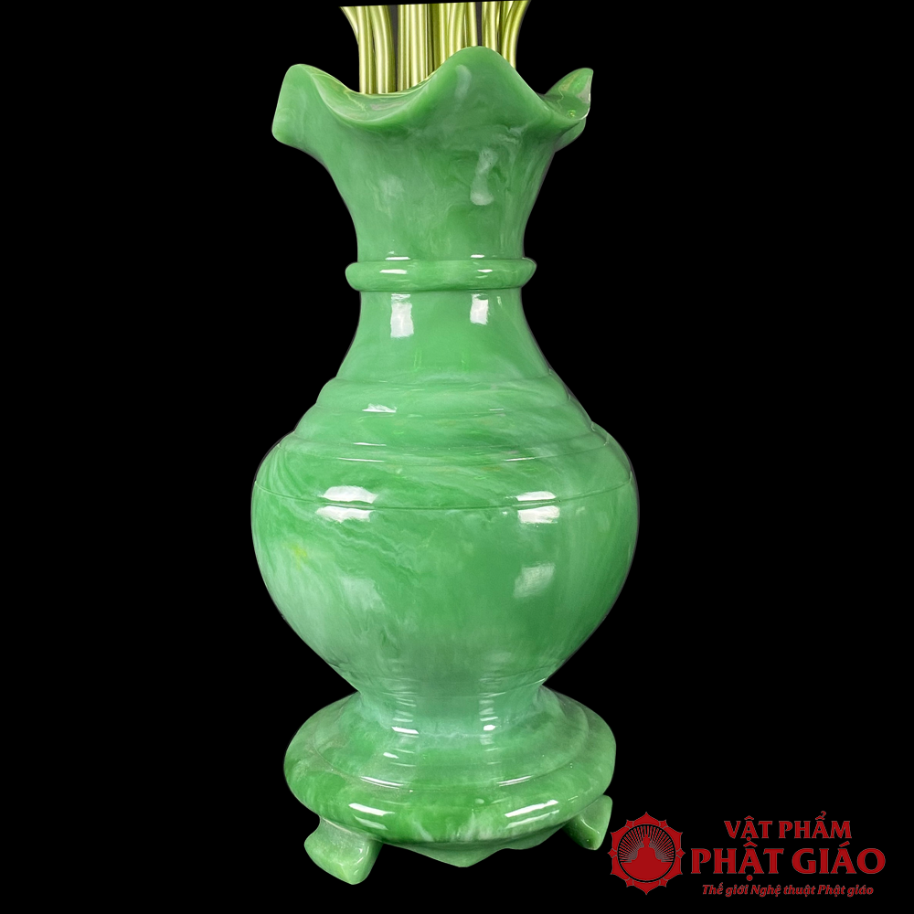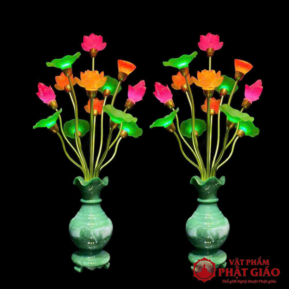 - Thiết kế: Mỗi đèn gồm 13 bông sen, tượng trưng cho sự sum vầy, viên mãn, 13 hạnh nguyện từ bi của chư Phật, Bồ Tát. Thân bình ngọc thon cao, kết hợp đế vững chắc, phù hợp với mọi không gian thờ Phật, bàn gia tiên hoặc điện thờ.