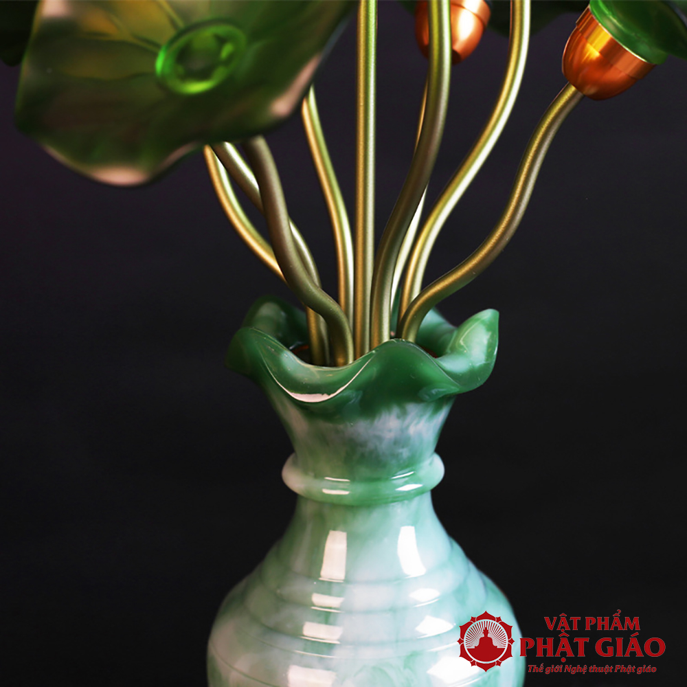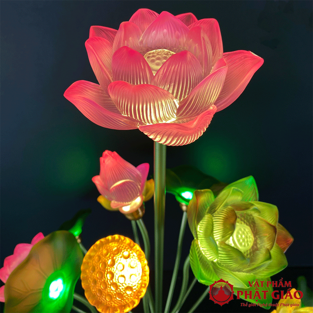 - Chất liệu: Thân đèn làm từ bình ngọc chắc chắn, mang vẻ đẹp thanh cao, trang trọng. 13 bông sen bằng thủy lưu ly cao cấp, trong suốt, sắc nét, phối 7 màu lung linh rực rỡ.