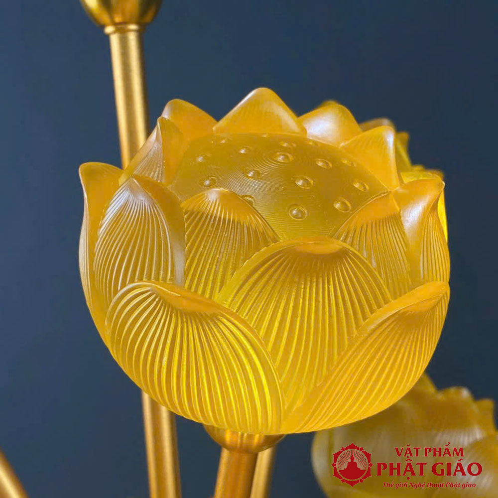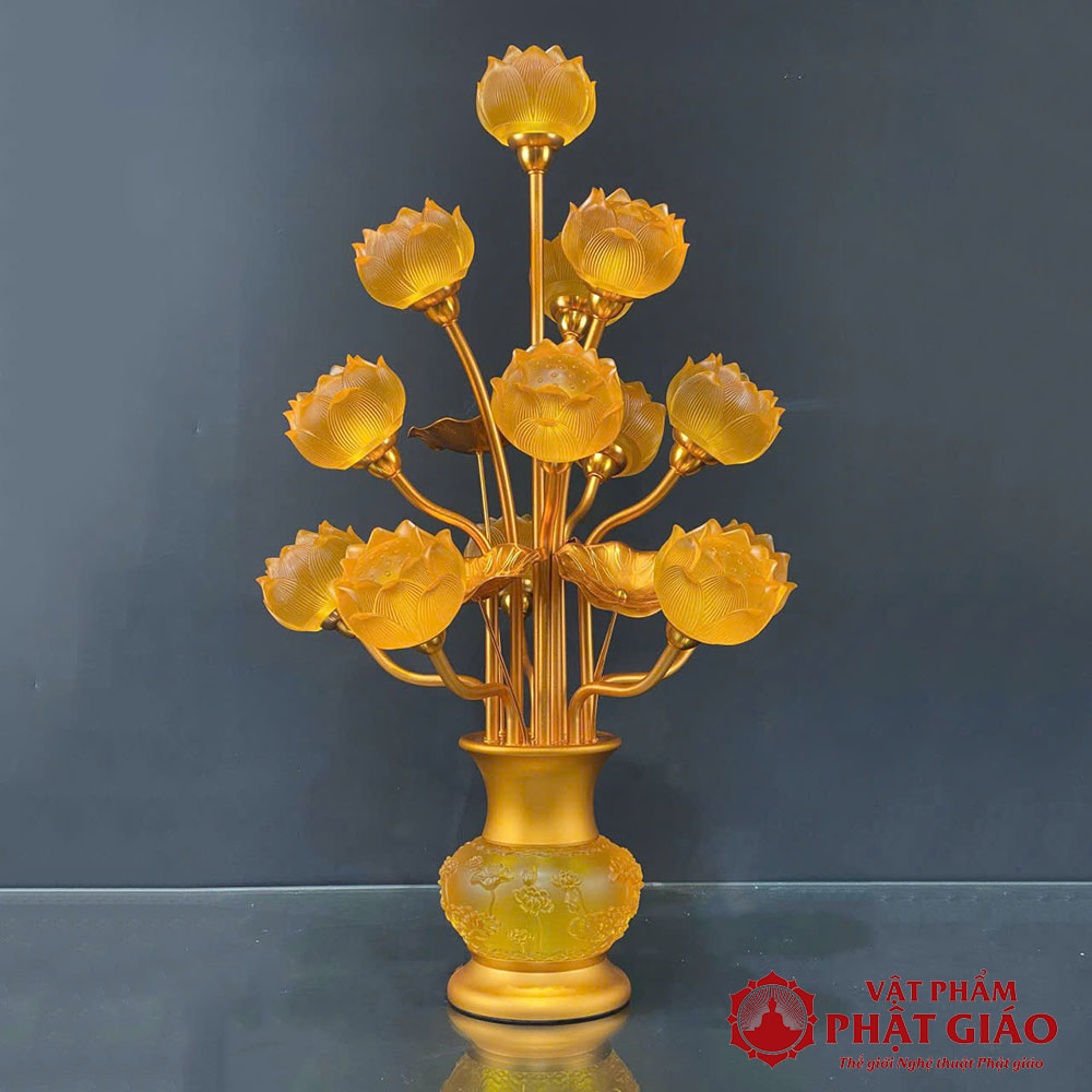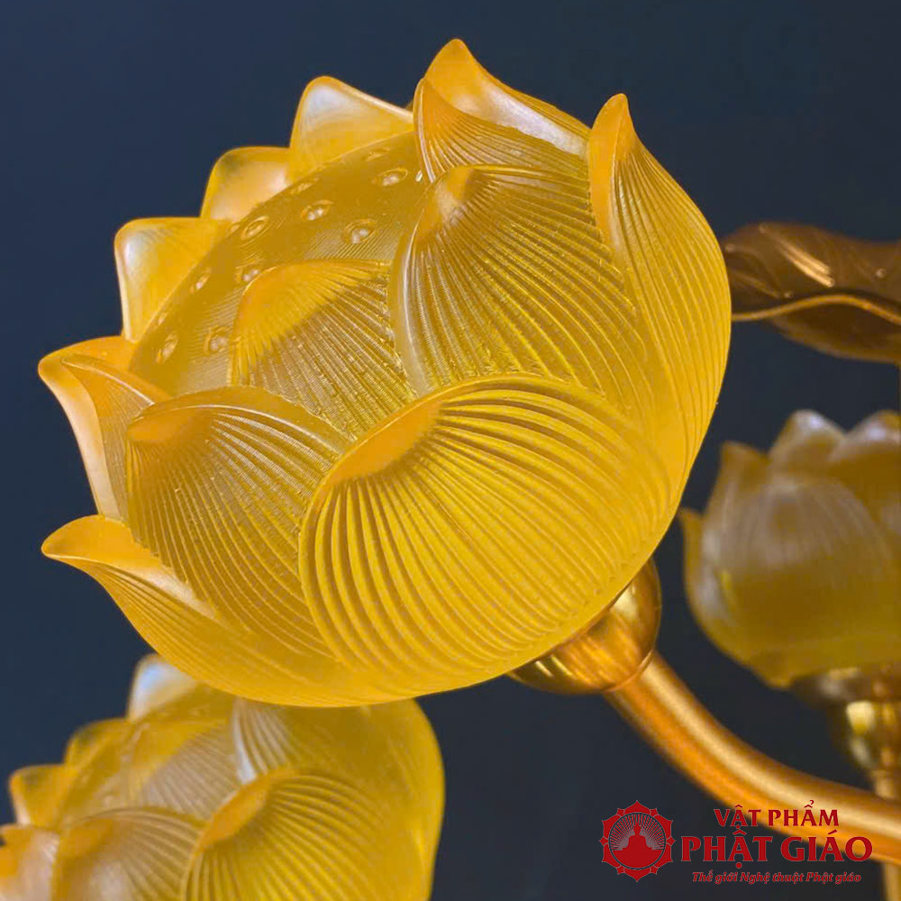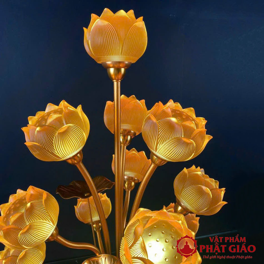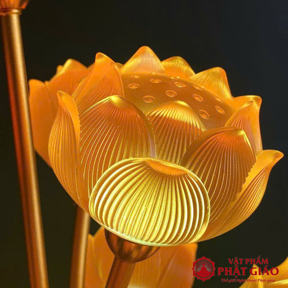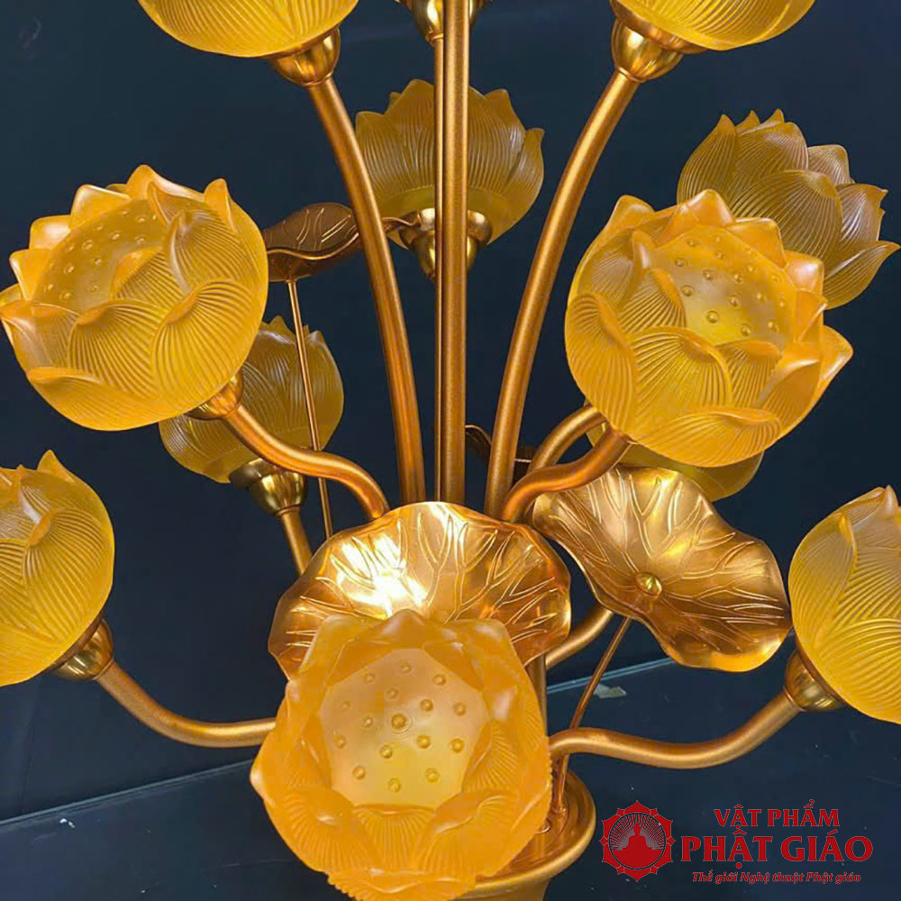 - Chất liệu: Thân đèn lưu ly cao cấp, trong suốt, ánh sáng lung linh kết hợp gam màu thanh thoát, đài sen cụp tinh tế.
