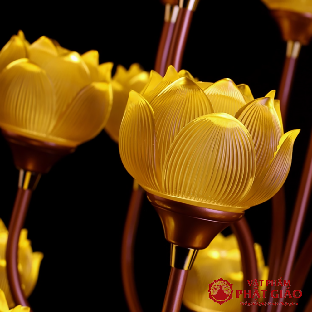 - Thiết kế: Thân đèn dáng cổ điển, họa tiết chạm khắc tinh xảo. 7 bông sen cụp tỏa ra cân đối, nhẹ nhàng, mang nét trang trọng mà giản dị.