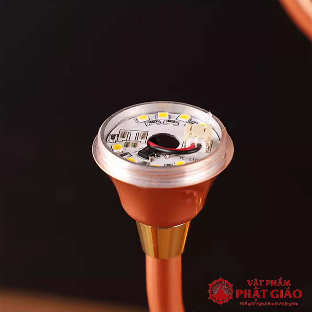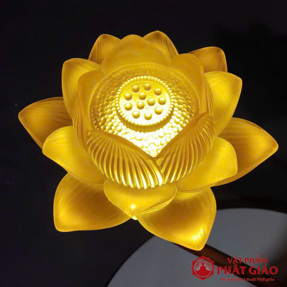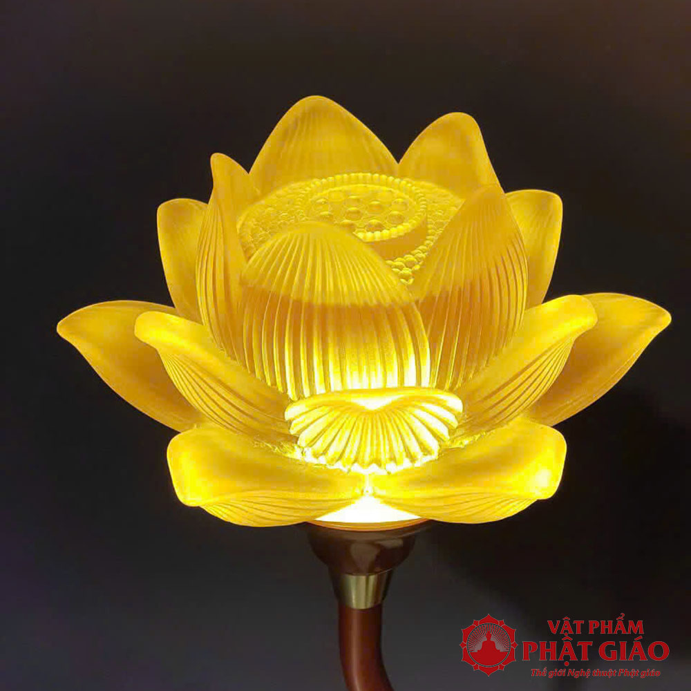 - Chất liệu: Thân đèn: Thủy lưu ly cao cấp, trong suốt và sắc nét, tạo cảm giác thanh tịnh, trang nghiêm. Hoa sen: 9 bông sen nở bằng lưu ly, cánh sen tinh xảo, tỏa ánh sáng nhẹ nhàng, trong trẻo.