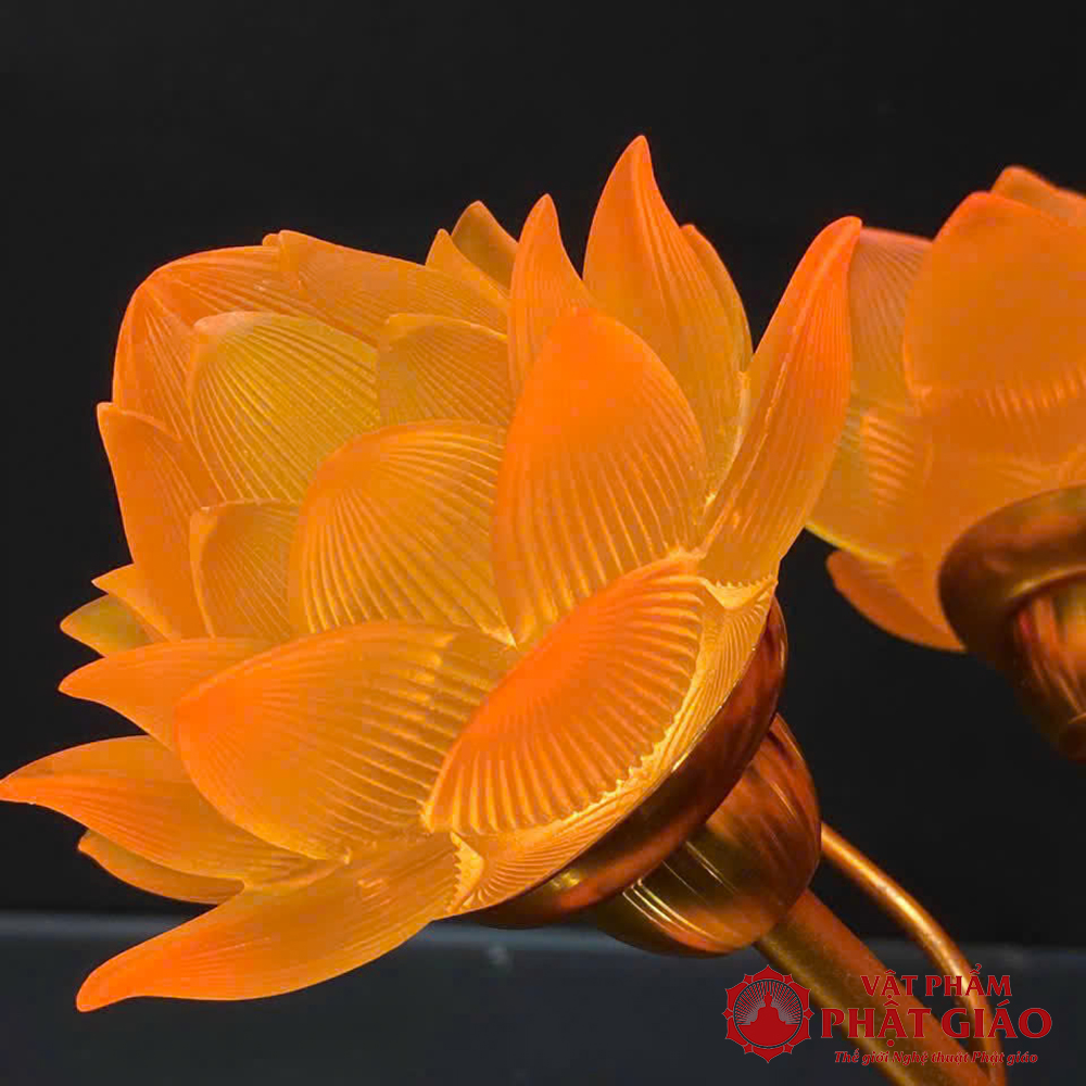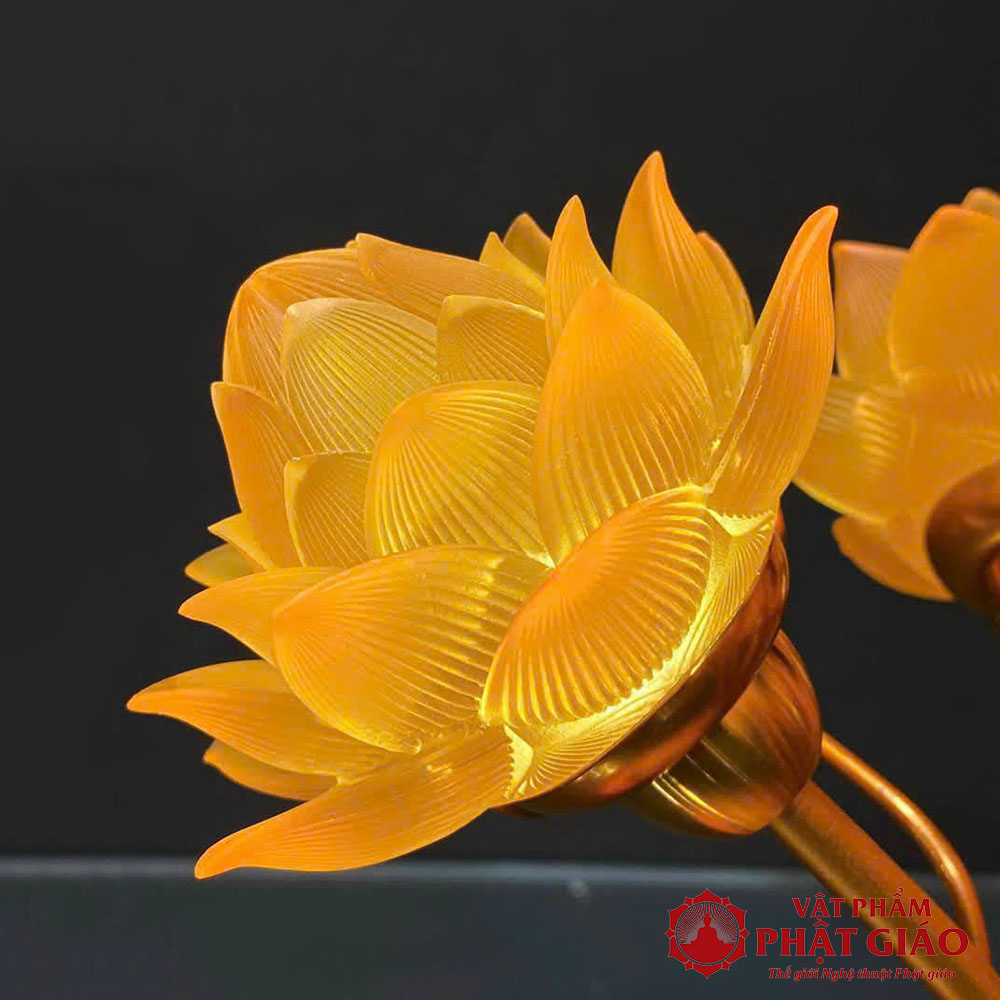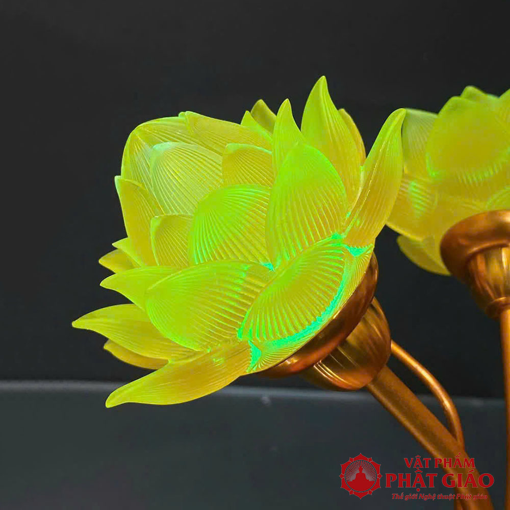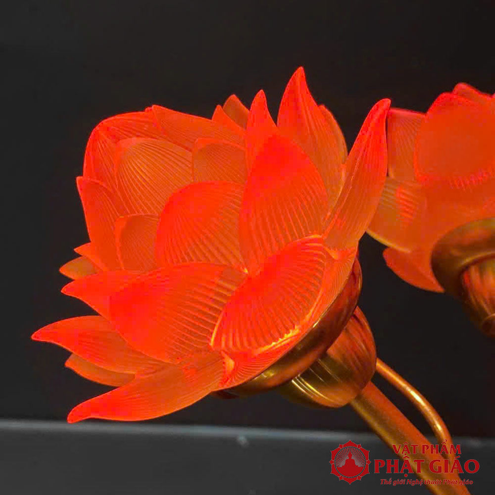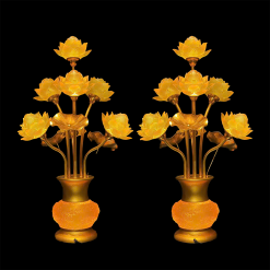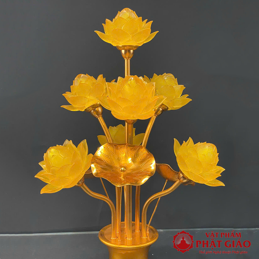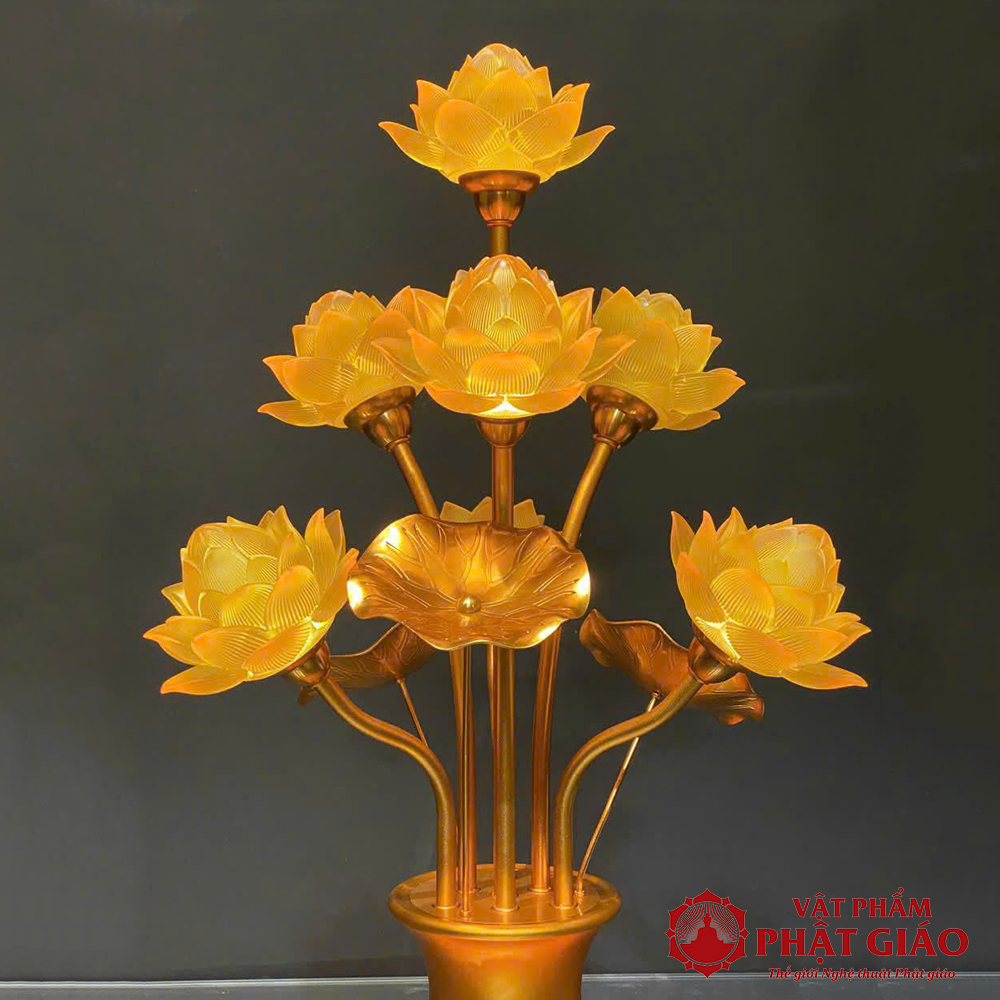 Đôi Đèn Thờ Bình Hoa Thịnh Thế Hoa Khai 7 Bông Lớn mang ý nghĩa tôn vinh sự thanh tịnh, trí tuệ và từ bi của chư Phật, chư Bồ Tát. Hình tượng bông sen nở rộ tượng trưng cho sự giác ngộ, vượt lên khỏi bùn lầy để hướng đến ánh sáng chân lý, là lời nhắc nhở con người tu dưỡng đạo đức, giữ tâm trong sạch. Con số 7 đại diện cho bảy đóa sen nâng bước Phật khi đản sinh, đồng thời cũng tượng trưng cho bảy phương Phật, bảy yếu tố giác ngộ, mang lại bình an, may mắn và thịnh vượng cho gia chủ. Ánh sáng ấm áp, dịu dàng của đôi đèn giúp soi sáng không gian thờ tự, xua tan u tối, tà khí, đồng thời tạo nên sự trang nghiêm, tôn kính, giúp kết nối tâm linh của gia đình với bề trên.