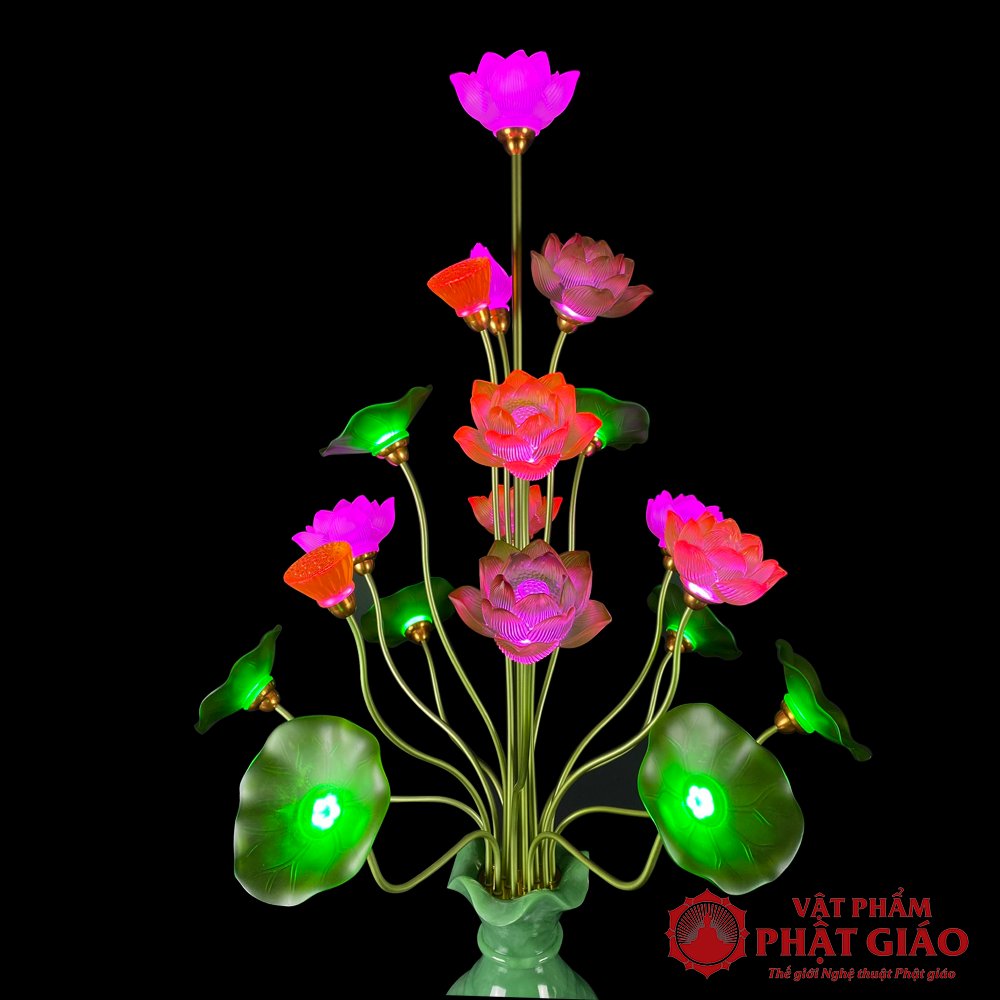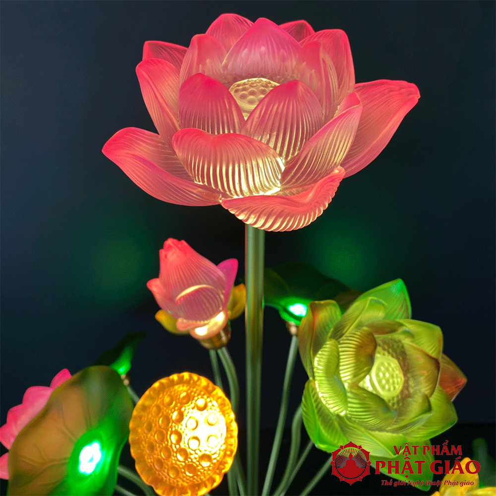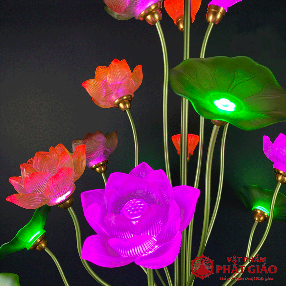 Hoa sen là biểu tượng thanh cao của Phật giáo, đại diện cho trí tuệ, sự giác ngộ và tâm hồn tinh khiết giữa chốn trần gian đầy bụi nhơ. Đôi đèn với 13 bông sen nở rộ tỏa sáng không chỉ mang ý nghĩa tôn kính dâng lên Tam Bảo mà còn là lời nguyện cầu bình an, cát tường, gia đạo hưng thịnh, phúc đức lâu dài. Con số 13 mang ý nghĩa trọn vẹn, đủ đầy, tượng trưng cho mười phương chư Phật và ba đời (quá khứ, hiện tại, vị lai), soi sáng khắp mười phương thế giới. Ánh sáng nhiều màu nhẹ dịu mang lại cảm giác ấm áp, an lạc, xua tan u tối, dẫn lối tâm hồn đến bến bờ an nhiên.