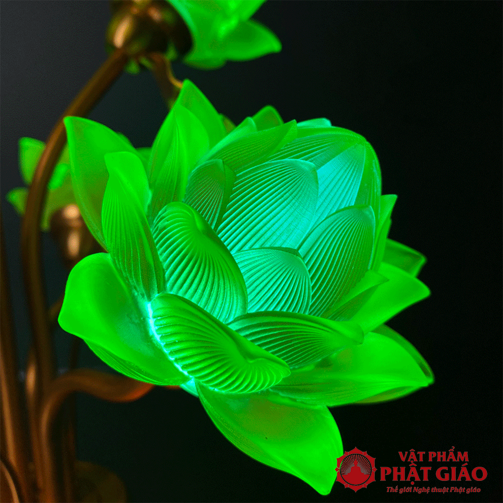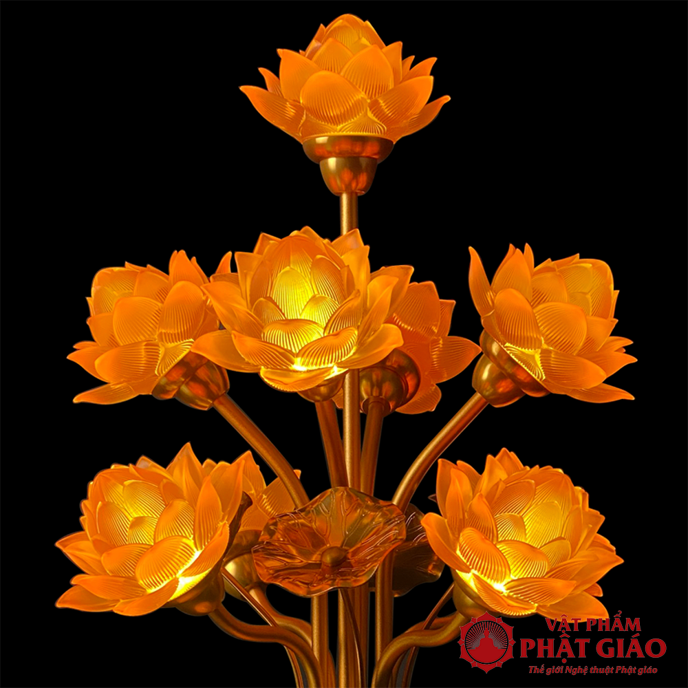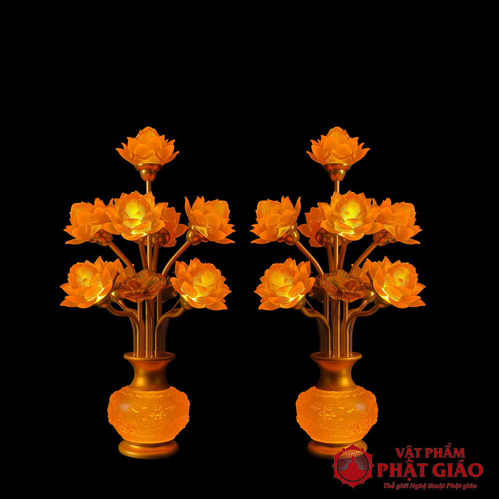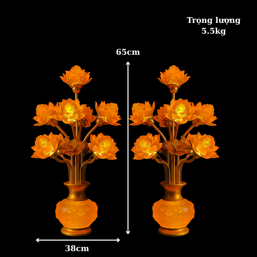 Đôi đèn hoa sen Thịnh Thế Hoa Khai 9 Bông vừa biểu hiện lòng tôn kính Tam Bảo, vừa là lời cầu chúc gia đình luôn sum vầy, an nhiên, con cháu hiếu thuận, phúc lộc lâu dài. Ánh sáng dịu dàng từ những bông sen như xua tan u tối, mang lại năng lượng tích cực, soi sáng tâm hồn trên con đường tu tập và hướng thiện.