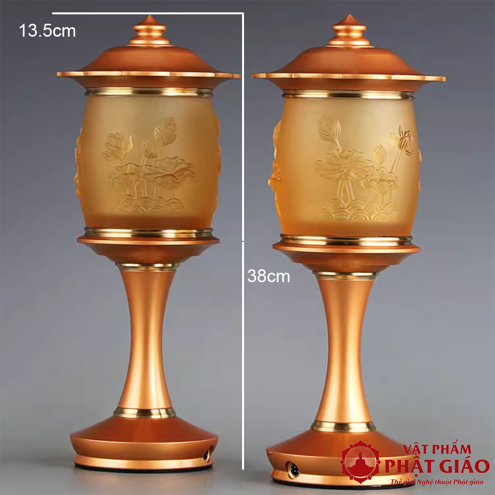 - Tên sản phẩm: Đôi Đèn Thờ Lưu Ly Chạm Hoa Sen Nổi Chân Đồng, Cao 38cm