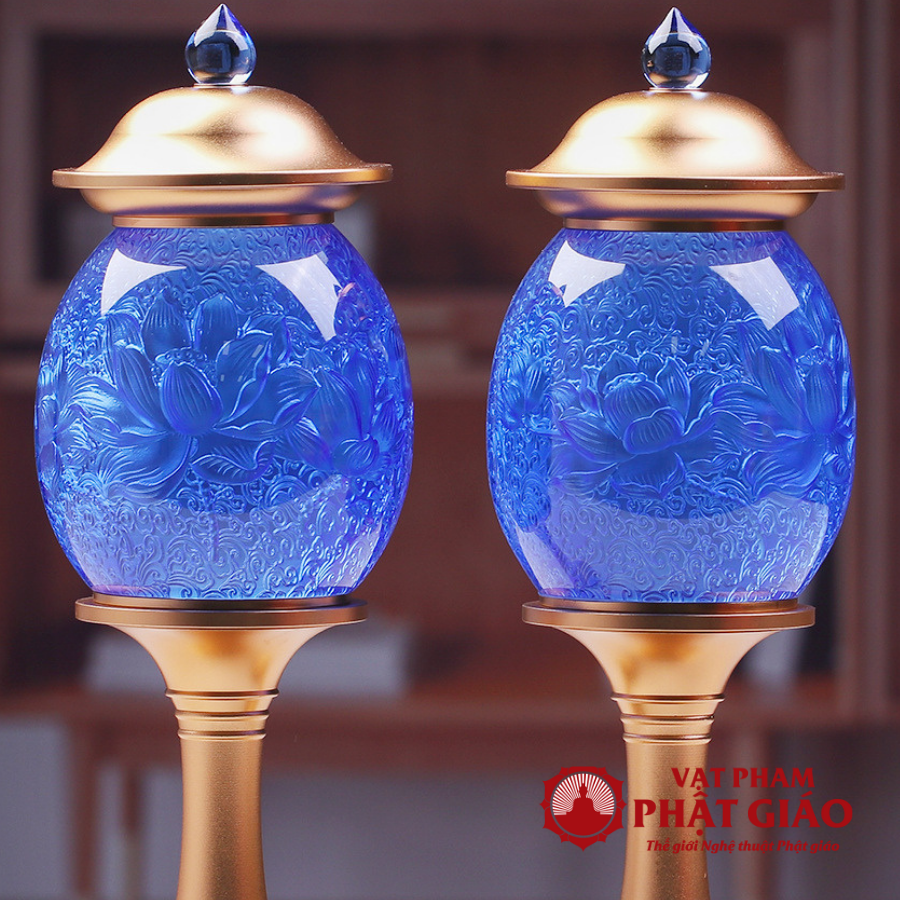 Đôi Đèn Thờ Lưu Ly Họa Tiết Hoa Sen Màu Xanh Coban, Nhiều Kích Cỡ