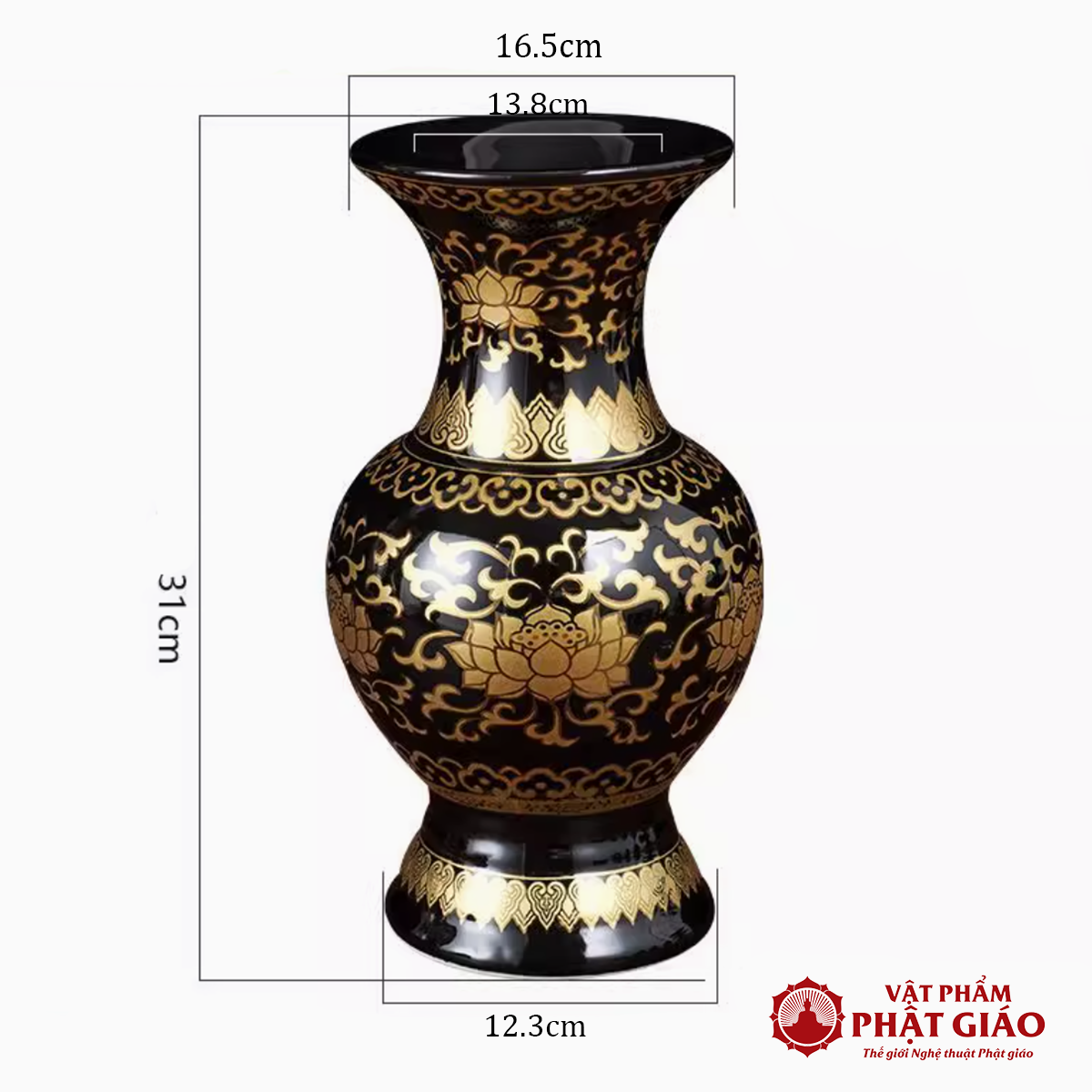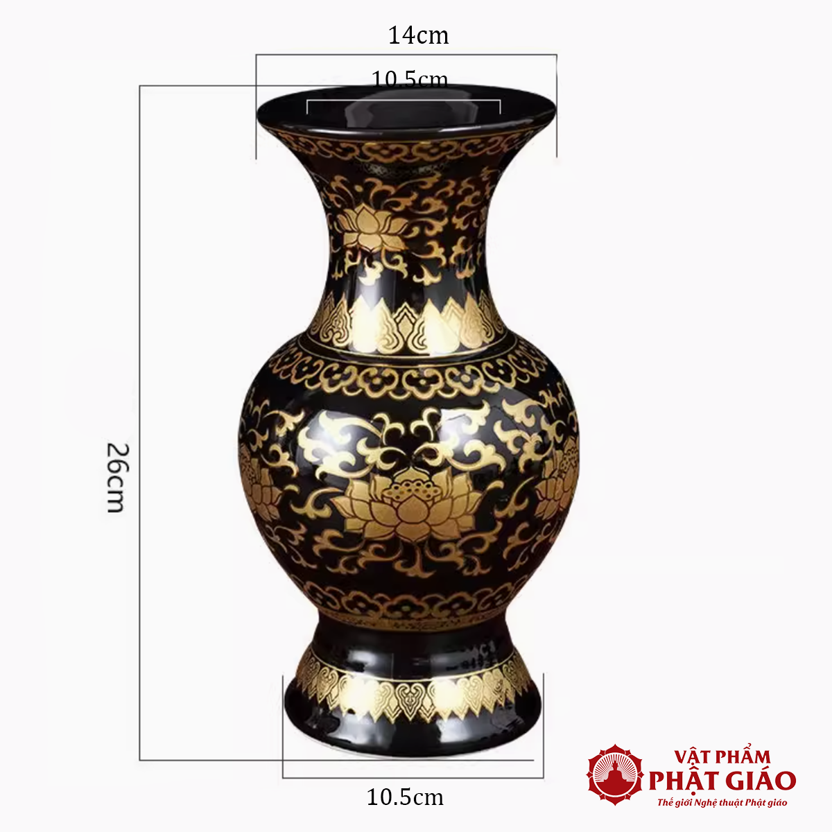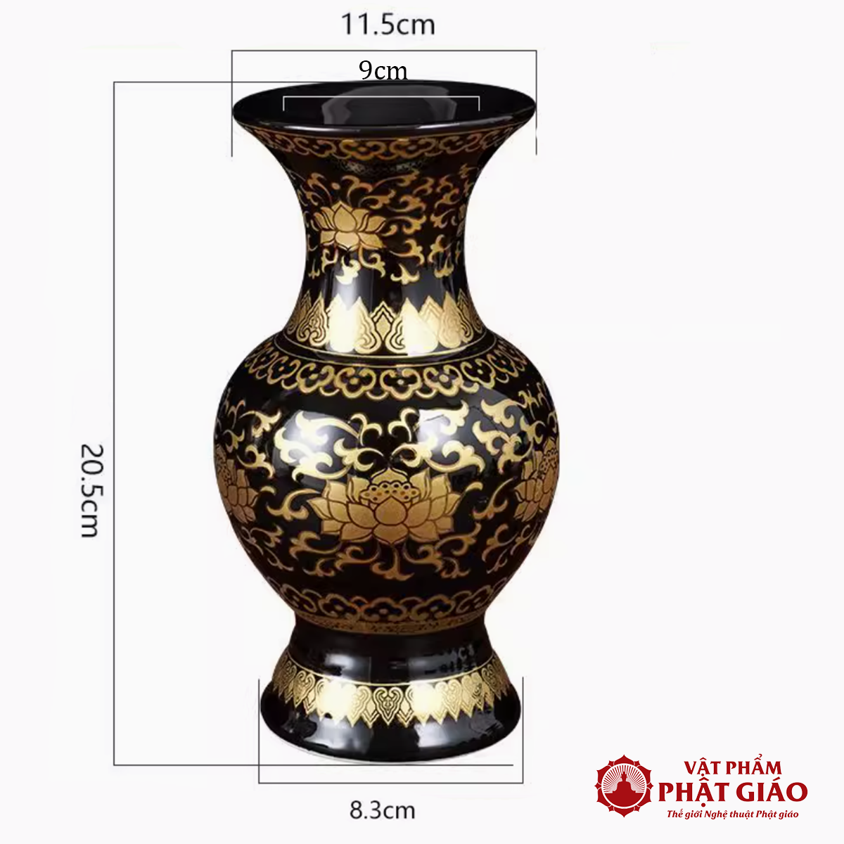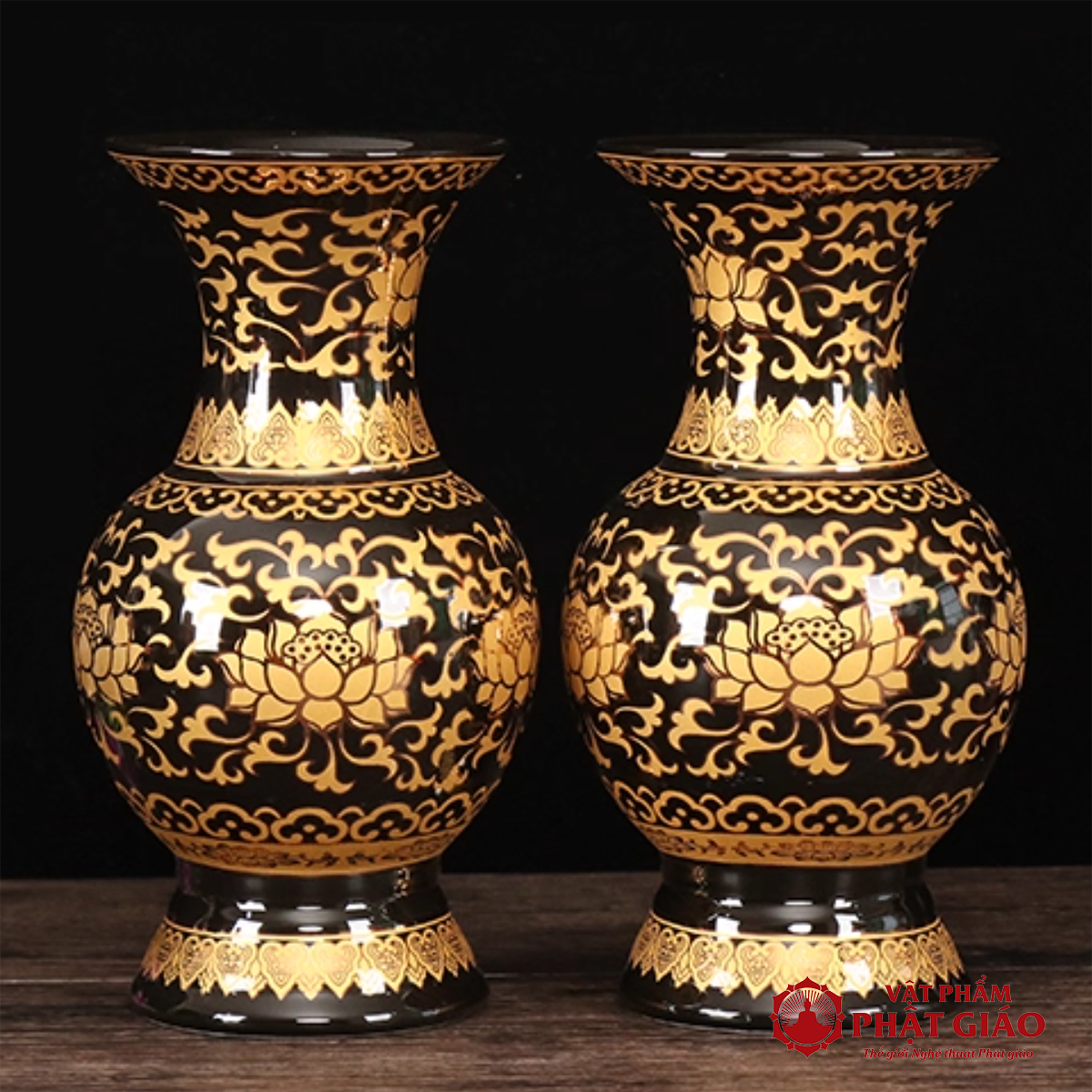 Lọ Hoa Thờ Cúng Bằng Gốm Màu Đen, Họa Tiết Sen Vàng, Nhiều Kích Cỡ