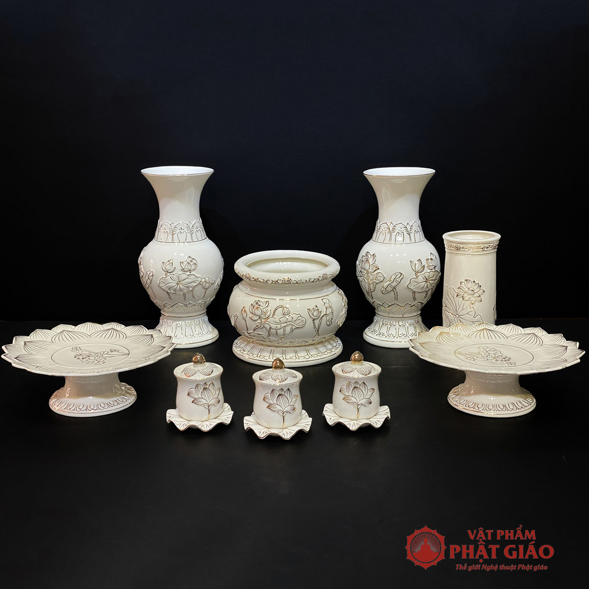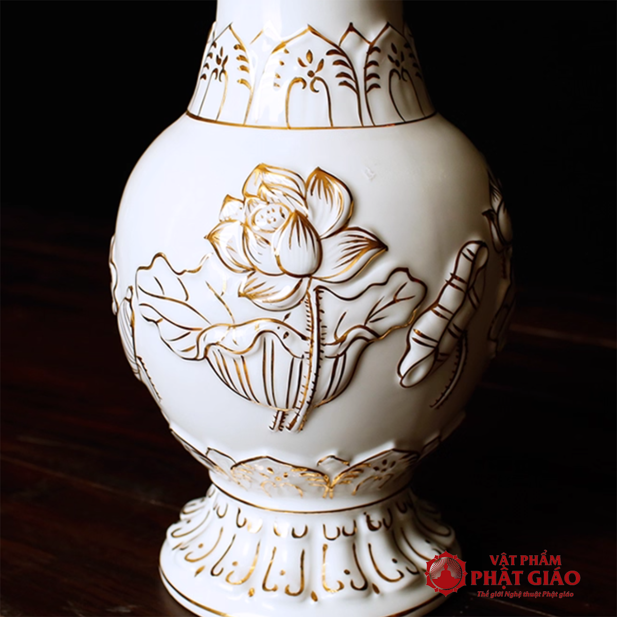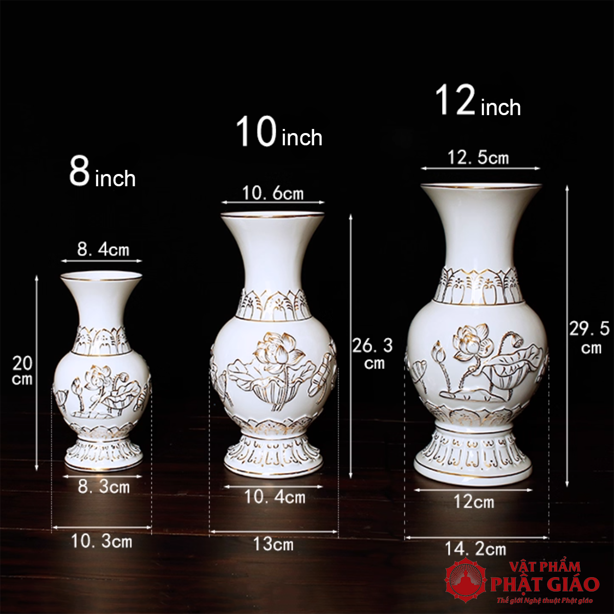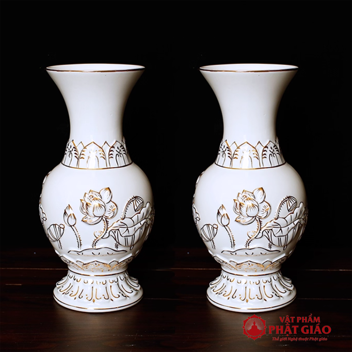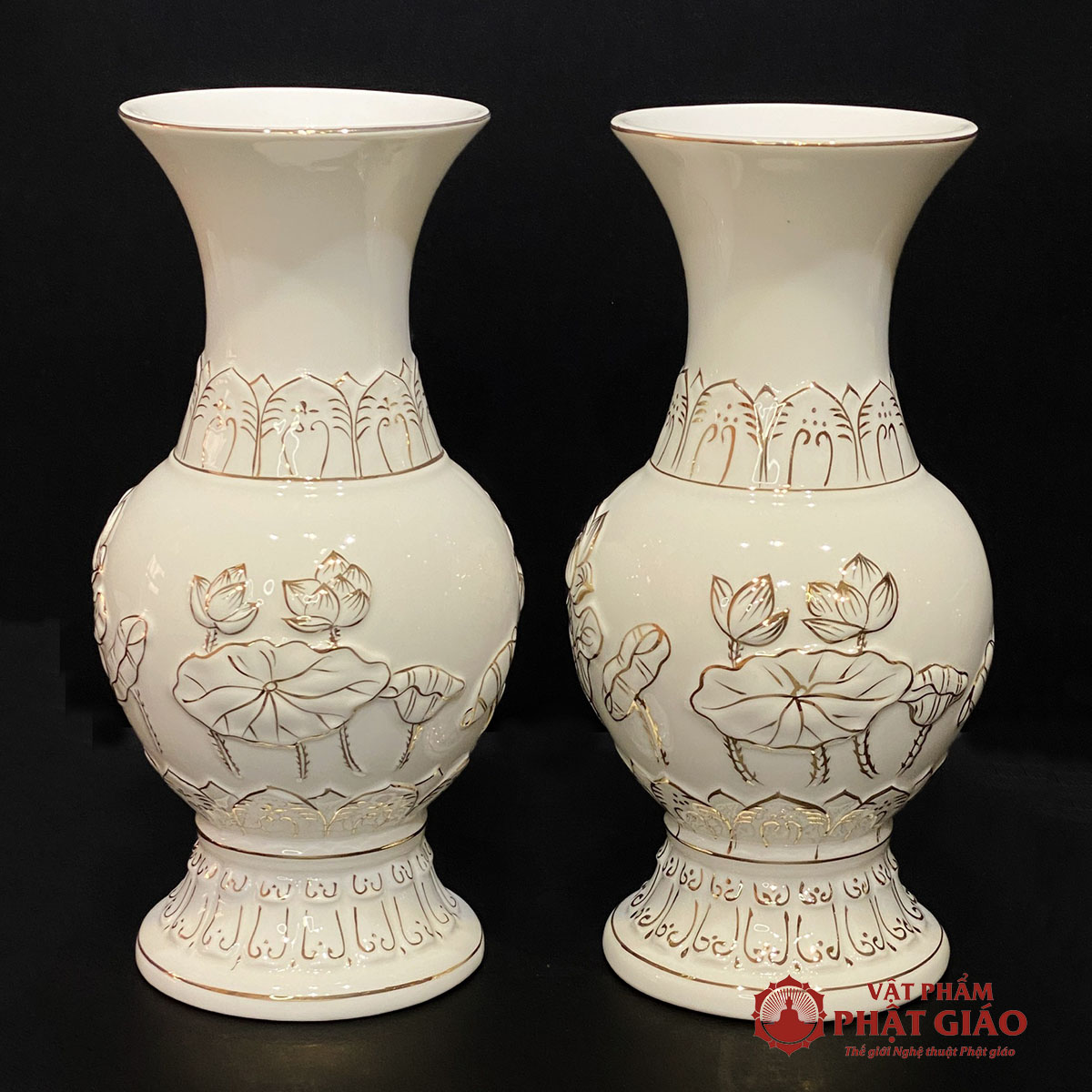 Lọ Hoa Thờ Cúng Bằng Sứ Trắng Hoa Sen Viền Vàng, Nhiều Kích Cỡ