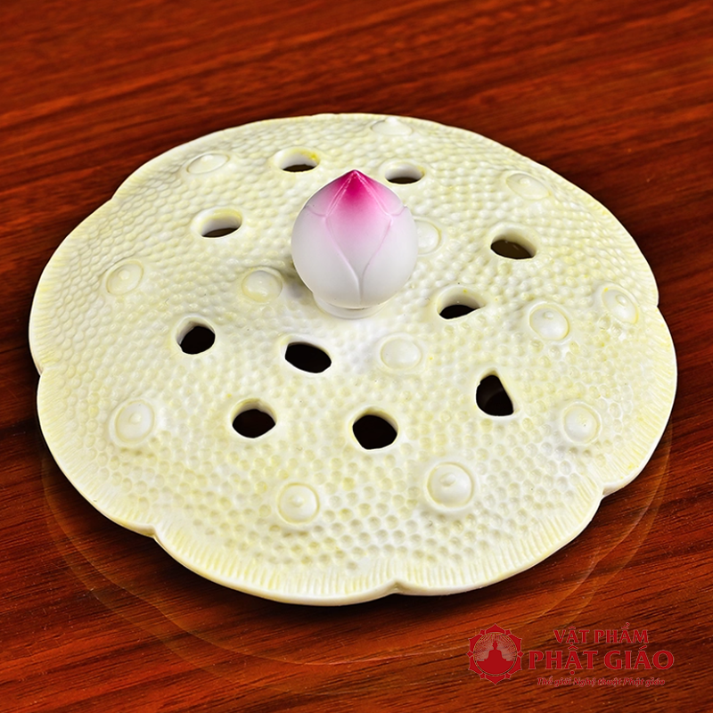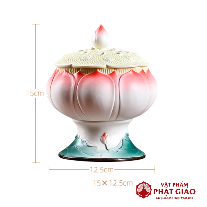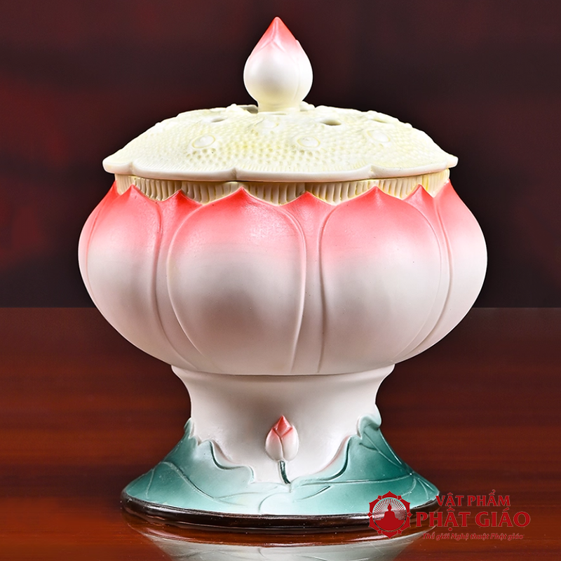 Chất liệu gốm sứ được nung ở nhiệt độ cao giúp sản phẩm chắc chắn, chịu nhiệt tốt và dễ vệ sinh, phù hợp để đựng tro hương hoặc làm vật phẩm trang trí mang tính tâm linh. Hình dáng đài sen biểu trưng cho tâm hồn thanh tịnh giữa cõi trần, giúp người thờ duy trì chánh niệm và lòng thành hướng Phật.