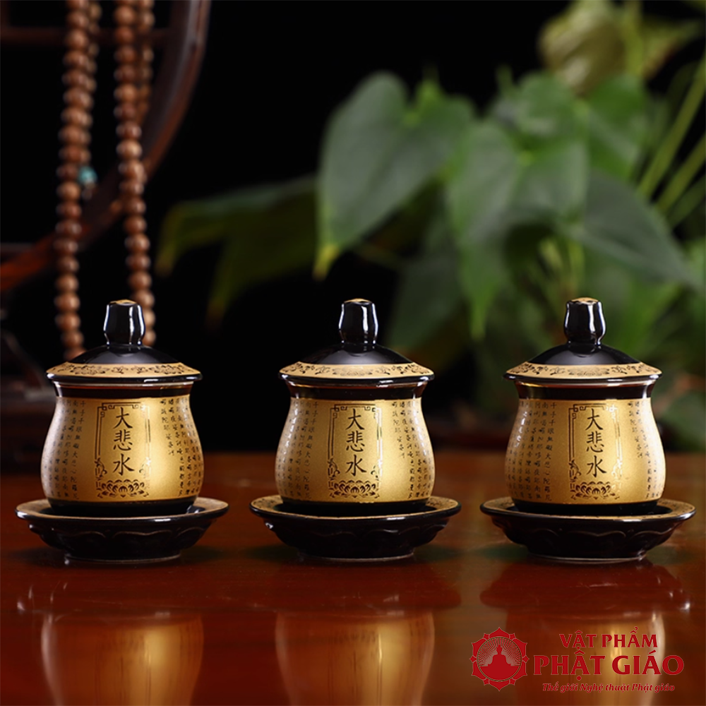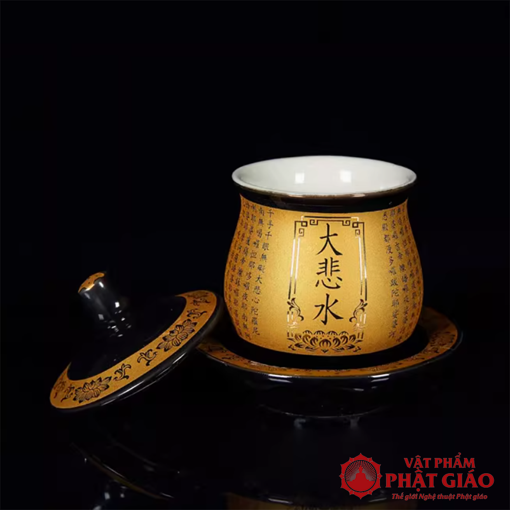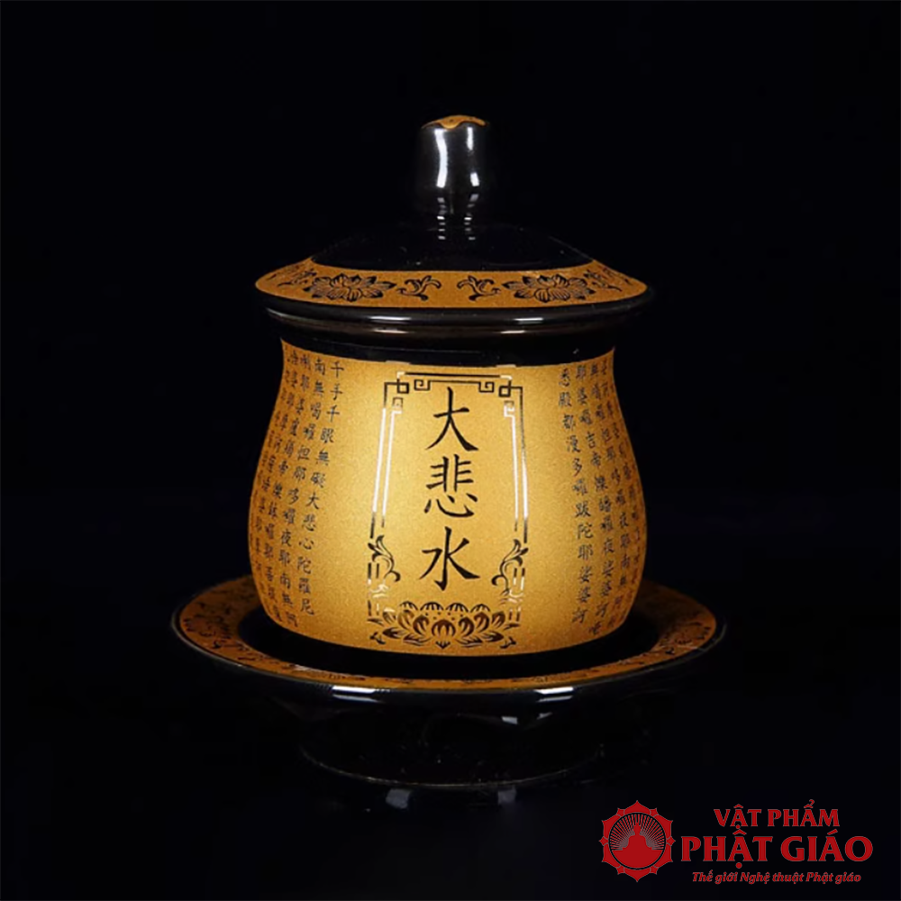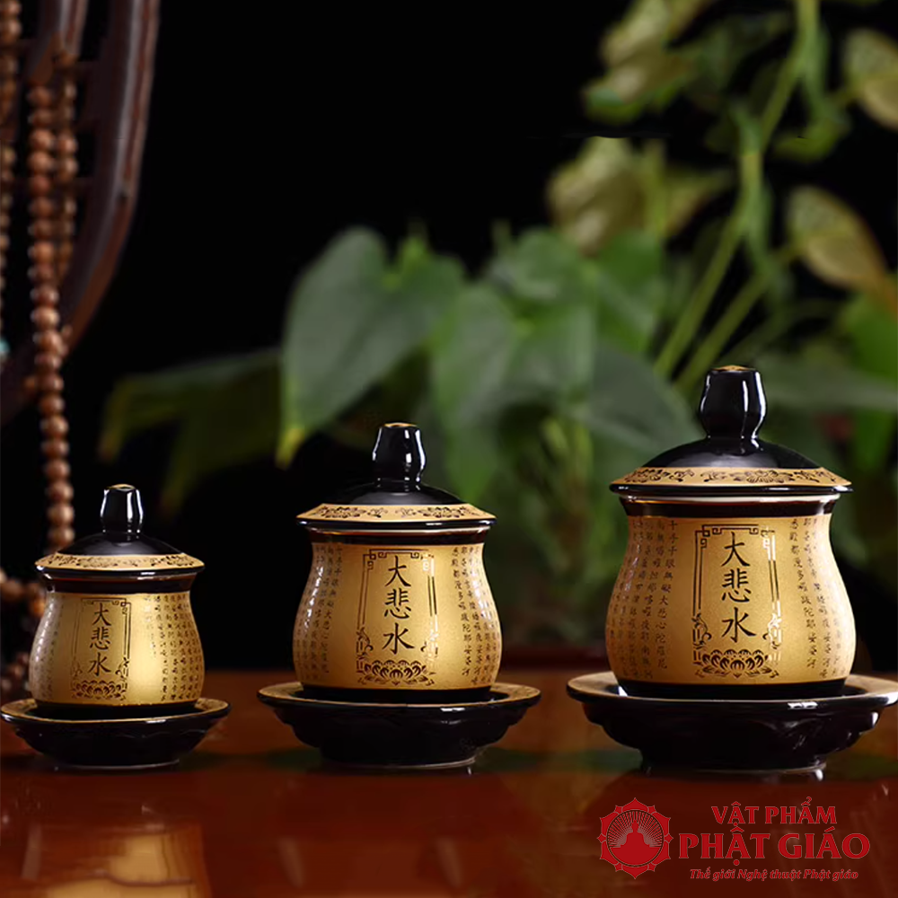 Ly Nước Thờ Gốm Màu Vàng Đen Đại Bi Thủy, Khắc Chú Đại Bi, Nhiều Kích Cỡ