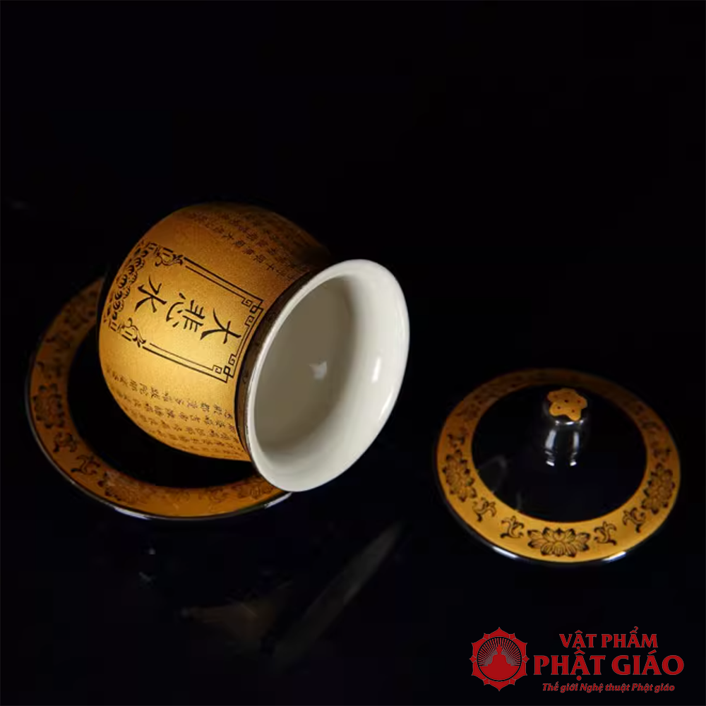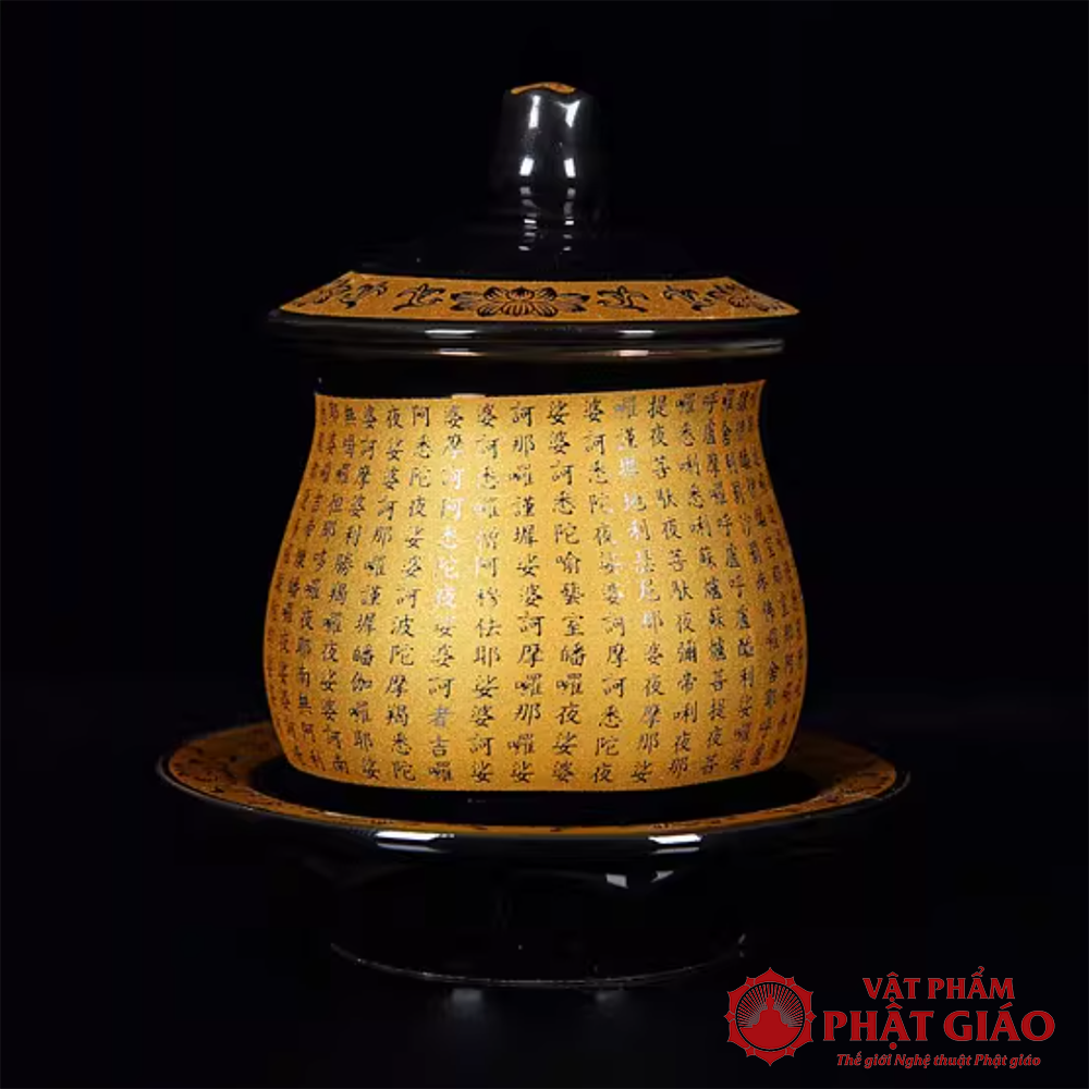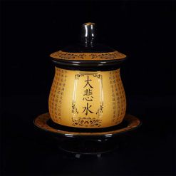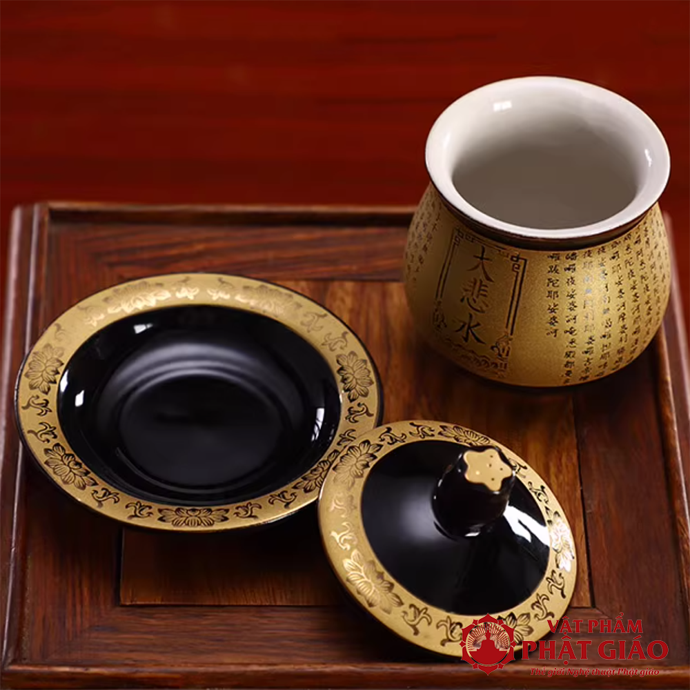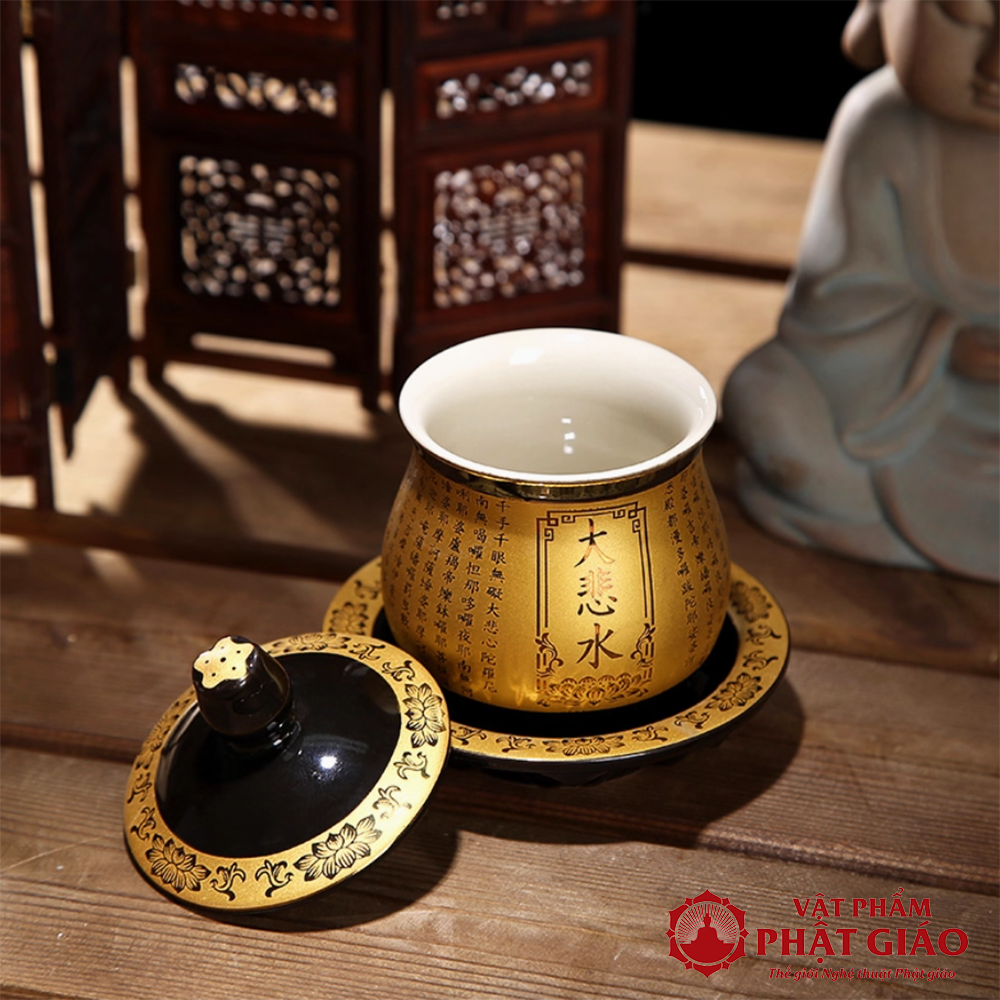 Ly Nước Thờ Gốm Màu Vàng Đen Đại Bi Thủy, Khắc Chú Đại Bi, Nhiều Kích Cỡ