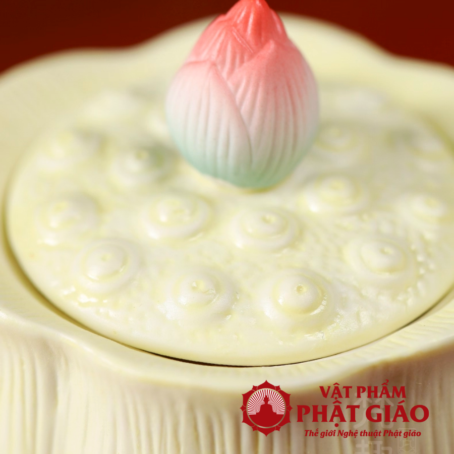 Bề mặt tráng men mịn, hoa văn đắp nổi sắc nét và đường cong mềm mại thể hiện tay nghề thủ công tinh tế của nghệ nhân. Kích thước vừa vặn giúp ly nước dễ phối hợp cùng các bộ bát hương, mâm bồng, đèn dầu, lọ hoa theo tông sen, tạo sự đồng bộ và thanh nhã cho không gian thờ tự.
