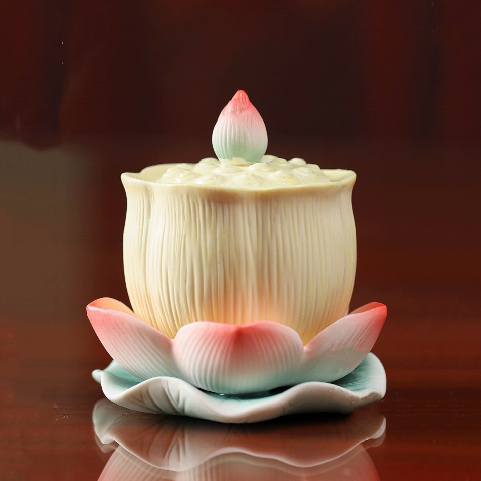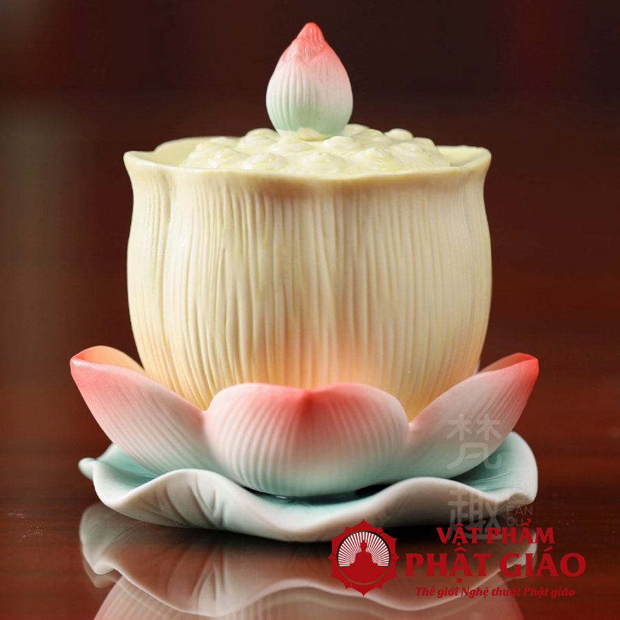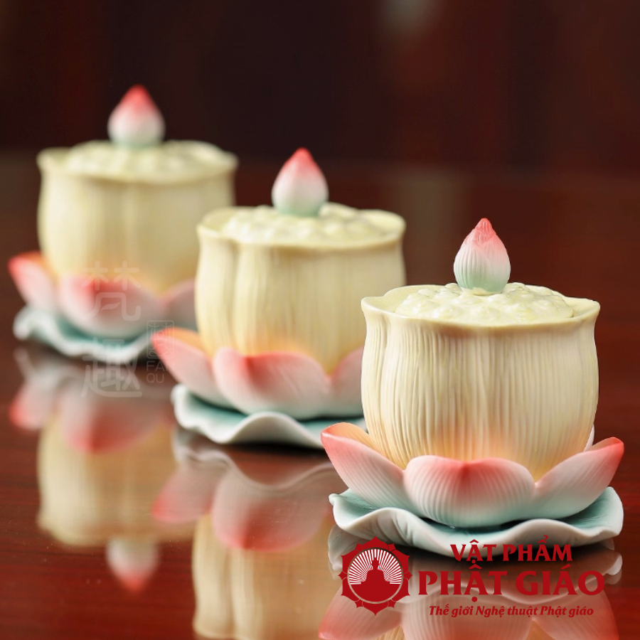 Cốc nước thờ hình bông sen nở tượng trưng cho sự thanh tịnh, thuần khiết và lòng thành kính dâng lên chư Phật, Bồ Tát và gia tiên. Nước trong đặt trong ly sen mang ý nghĩa tịnh thủy, giúp thanh lọc tâm ý, cầu mong bình an, phước lành và sự sáng suốt trong cuộc sống.