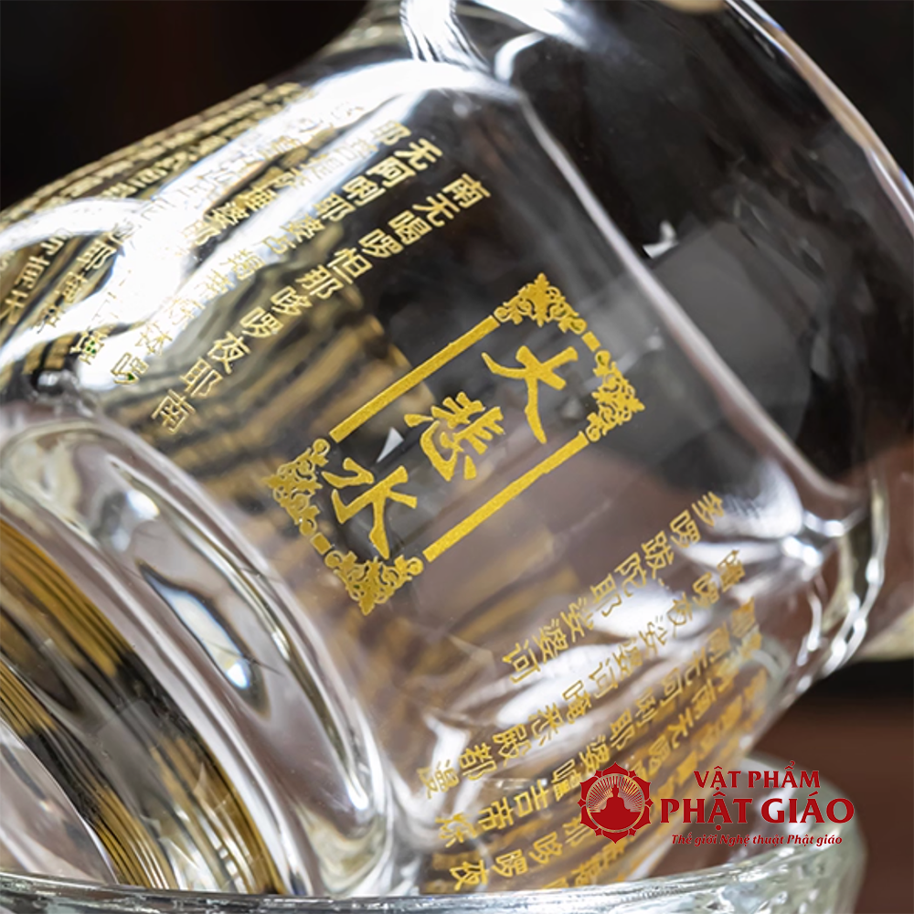 Chú Đại Bi là một trong những thần chú linh nghiệm nhất trong Phật giáo, mang năng lượng từ bi, tịnh hóa và cứu khổ cứu nạn. Ly nước khắc Chú Đại Bi giúp gia trì nước trở nên thanh tịnh, khi được dâng cúng hay sử dụng đều mang lại công đức lớn. Chất liệu pha lê thanh khiết tượng trưng cho trí tuệ sáng suốt, phản chiếu chân tâm và giúp người tu giữ được chánh niệm.