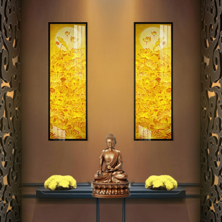 Tranh Trúc Chỉ In Đối Họa Tiết Hoa Sen Trăng TC175 nổi bật với hình ảnh những đóa sen nở rộ tinh khiết kết hợp mặt trăng dịu dàng, mang đến vẻ đẹp thanh tao, tinh khôi và trang nhã, ngay lập tức tạo điểm nhấn cho bất kỳ không gian thờ cúng nào.