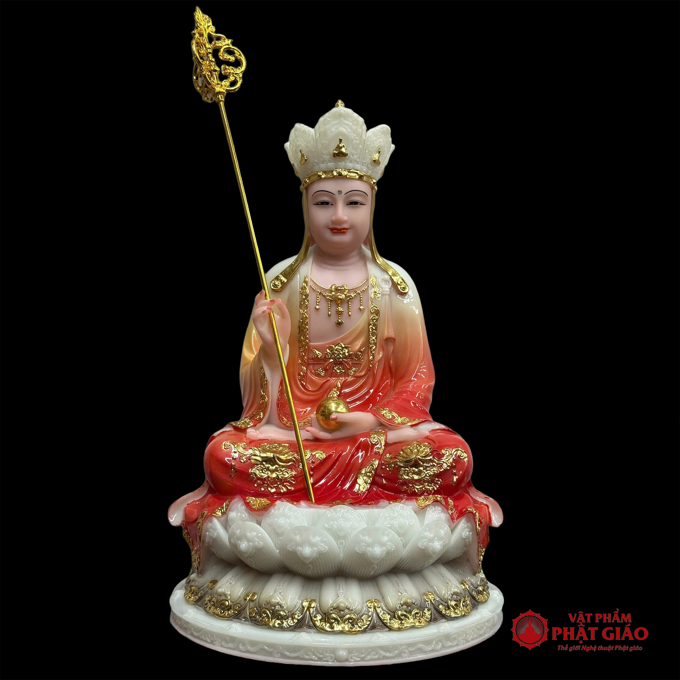 - Chất liệu: Chế tác từ bột đá cao cấp, phủ lớp sơn đỏ ánh vàng nổi bật, mang lại vẻ trang nghiêm, rực rỡ mà vẫn thanh tịnh. Từng chi tiết như vầng hào quang, áo cà sa, trượng Như Ý và đài sen đều được thực hiện tinh xảo, thể hiện thần thái từ bi và uy nghi của Ngài.